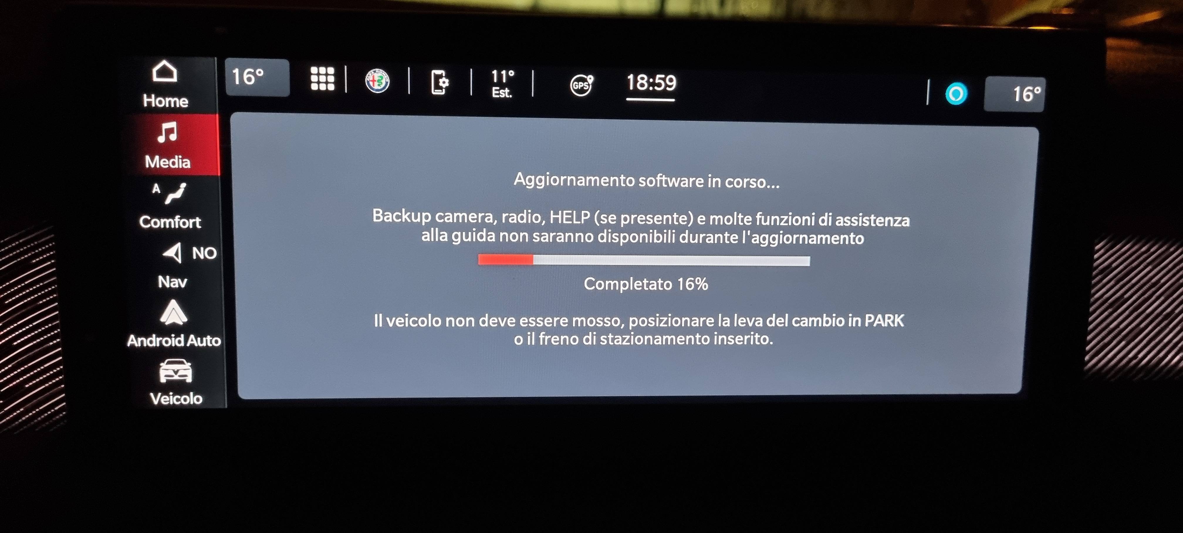...posso raccontare la mia esperienza di un'oretta fa: arrivato nel cortile davanti al mio garage ho notato la scritta che preannunciava l'aggiornamento software, ho messo l'auto in garage, spento il motore, lasciando acceso il quadro strumenti, e ho aspettato che l'aggiornamento proseguisse. All'inizio è partito un pò lento, all'incirca fino al 16% poi si è velocizzato, ogni tanto la schermata diventava nera, poi è comparsa una scritta a caratteri piccoli... aggiornamento android... poi ancora la schermata di aggiornamento. Infine è comparsa la scritta del completamento della versione aggiornata del software... non mi sembra che sia passato più di un quarto d'ora dall'inizio. Non so se spegnendo tutto e andando via, l'aggiornamento si sarebbe completato lo stesso...