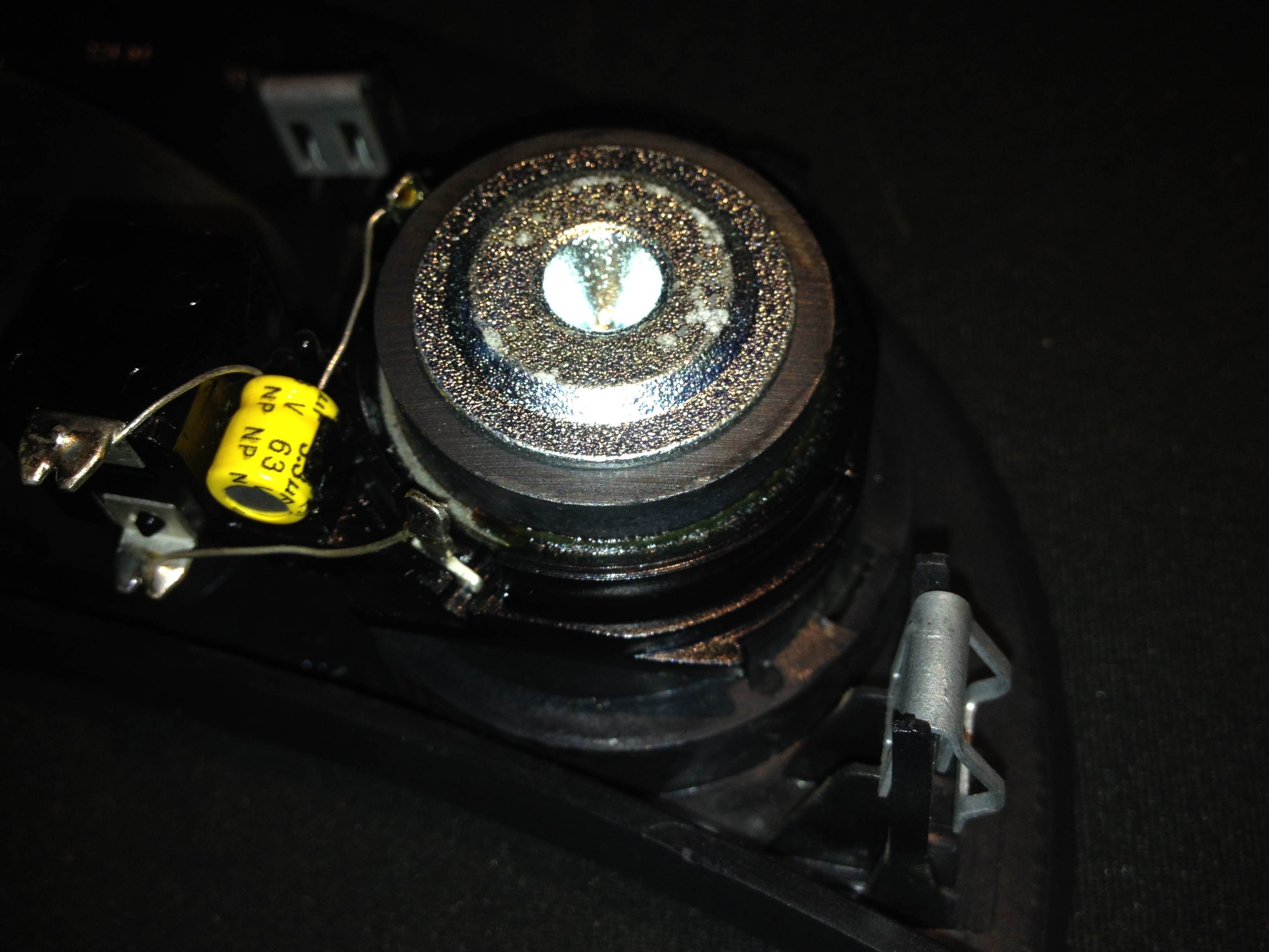 Ho gia' smontato tutto il blocco seguendo un video (che non parla di smontaggio tweeter ma dello smontaggio della portiera) che fa vedere anche come smontare la mascherina della maniglia interna ma quando arriva allo sganciamento del tweeter (si vede da lontano non nel dettaglio) toglie la retina (e qui lho fatto) e poi dall'interno spinge il tweeter e lui esce da dietro senza sganciare il connettore pero' credo che non sia originale quel tweeter perche' quello che ho io (mai cambiato) spingendo da dentro non esce infatti ho sganciato il connettore ed eccolo qua: