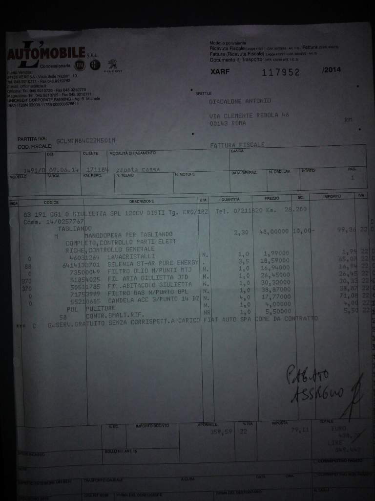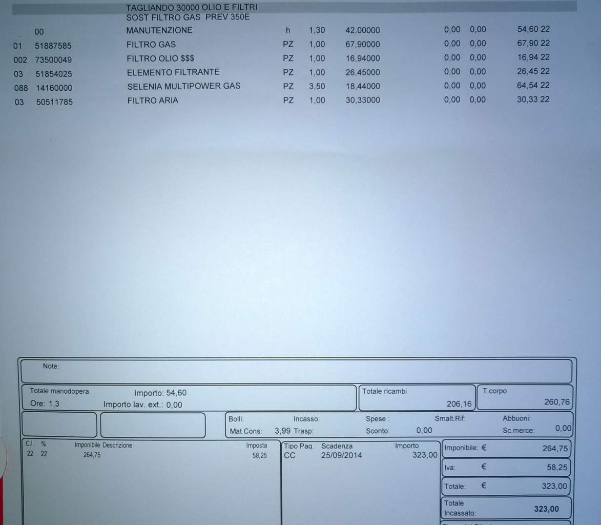 Questa è la fattura, dove si può vedere benissimo sulla seconda riga "PREV. 350E" (Viene quindi anche indicato che la lavorazione è riferita ad un preventivo di 350 euro) mentre furbescamente indicano solo "OLIO FILTRI E FILTRO GAS" ma non le candele come da programma ufficiale Alfa Romeo da cui tra l'altro hanno fatto la stampa per il preventivo che vi ho fatto vedere.