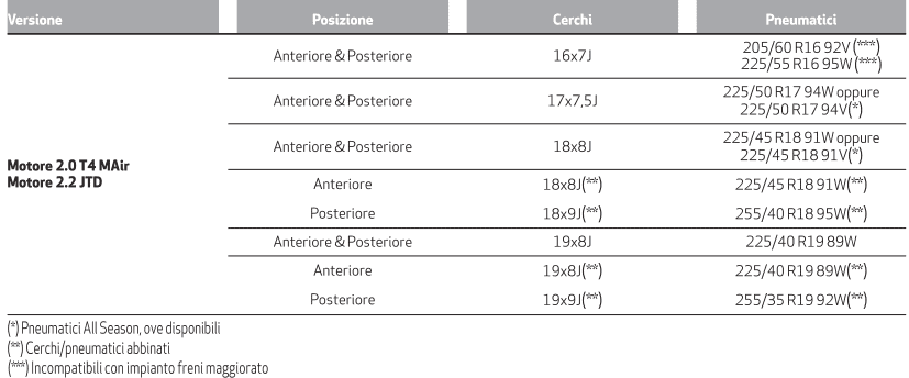 Entro in questo 3D un po' in ritardo, scusatemi, ed ho letto i vari post; vi dico quindi la mia. Ho da dicembre una 2.0 TB AT8 imm. 08/2019 con poco meno di 70KKm. Per piacermi, doveva essere per forza rossa e per forza a benzina, forse perchè, non essendo un vero alfista, ho una visione troppo limitata del marchio e quindi non avrei apprezzato niente altro. Per trovarla così, però, ho dovuto adattarmi un po' prendendone una di importazione. Vendutami gommata nuova 225/45 R18 + 255/40 R18 (a libretto). In generale, sono per gommature non troppo estreme che siano (su strada) meno impegnative e più sicure, a scapito della pura estetica e dico, proviamo ad apprezzare il look un po' vintage della spalla più alta. @ Danny, il mio consiglio è di mantenere il tuo formato attuale; l'R18 (che ho io) lo considero già al limite, mentre le 225/40 R19 + 255/35 R19 (anche a libretto) le vedo un po' troppo "ruote di carro", specialmete con le nostre strade butterate dai meteoriti. Per i cerchi, su un'Alfa li vedo ruvidi e corsaioli, non "fighetti": se fossi in te starei su un disegno Alfa, oppure un cattivo stile BBS canale rovesciato, non necessariamete costosi BBS. Io sulla mia BMW ho i Dotz Revvo Dark che secondo me sulla giulia ci starebbero da dio, poi son gusti... (allego formati alternativi a libretto)