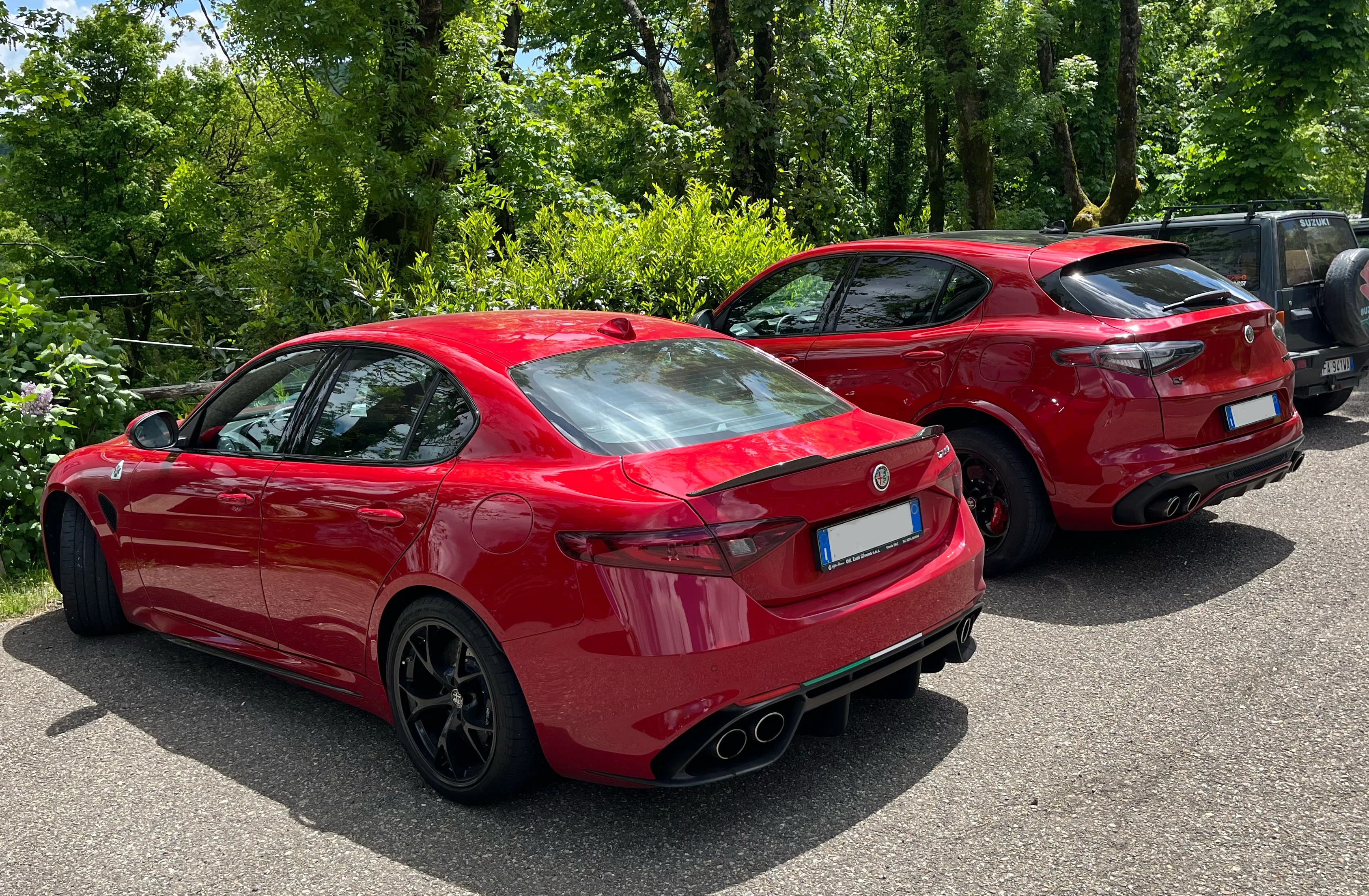 La Sua Stelvio è meravigliosa, rosso Etna, con carboceramici larghi come una rotonda e splendente sotto al sole. Bellissima, anche se fa a botte con le stampanti…lui sa di cosa parlo 😄
