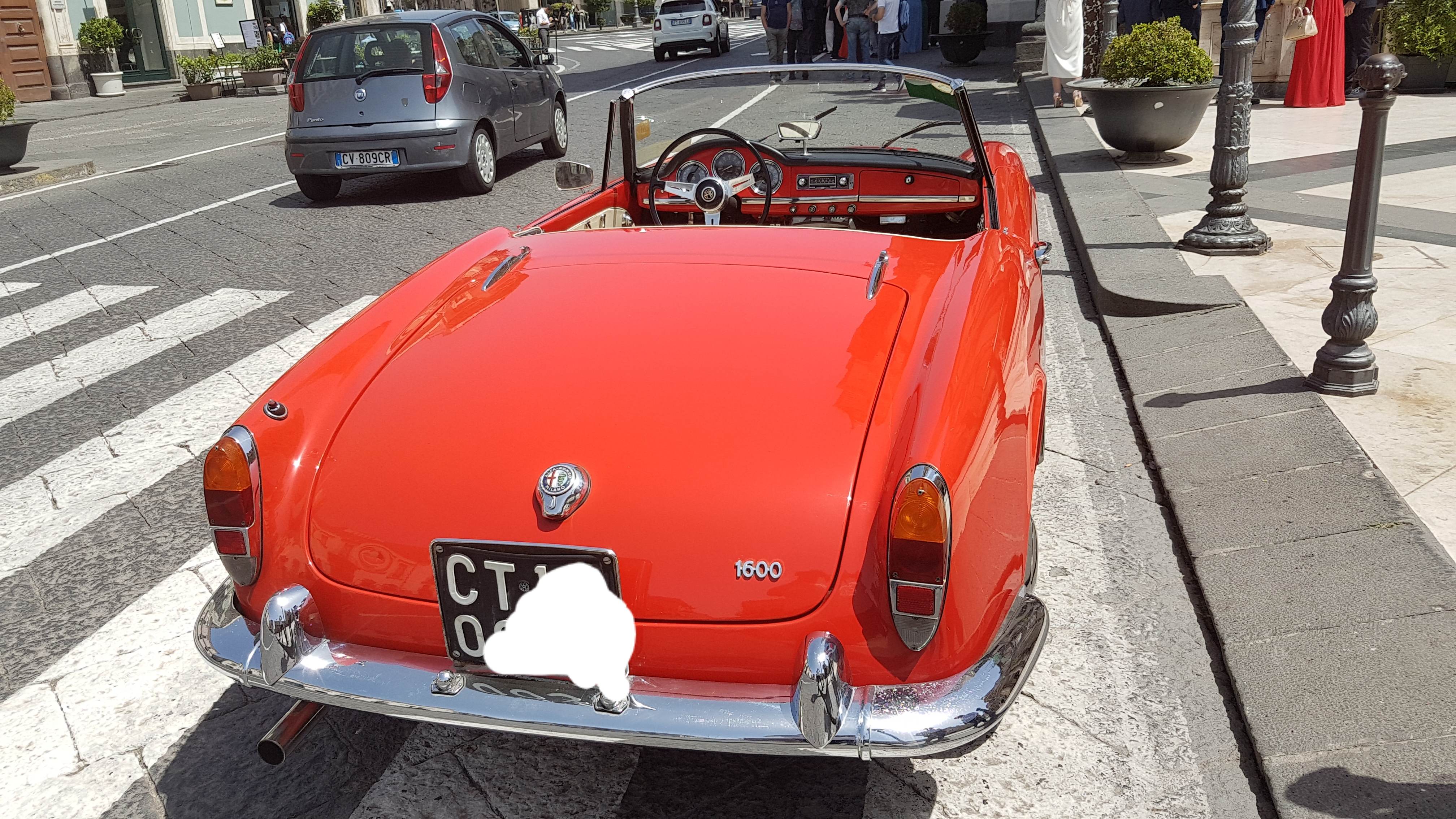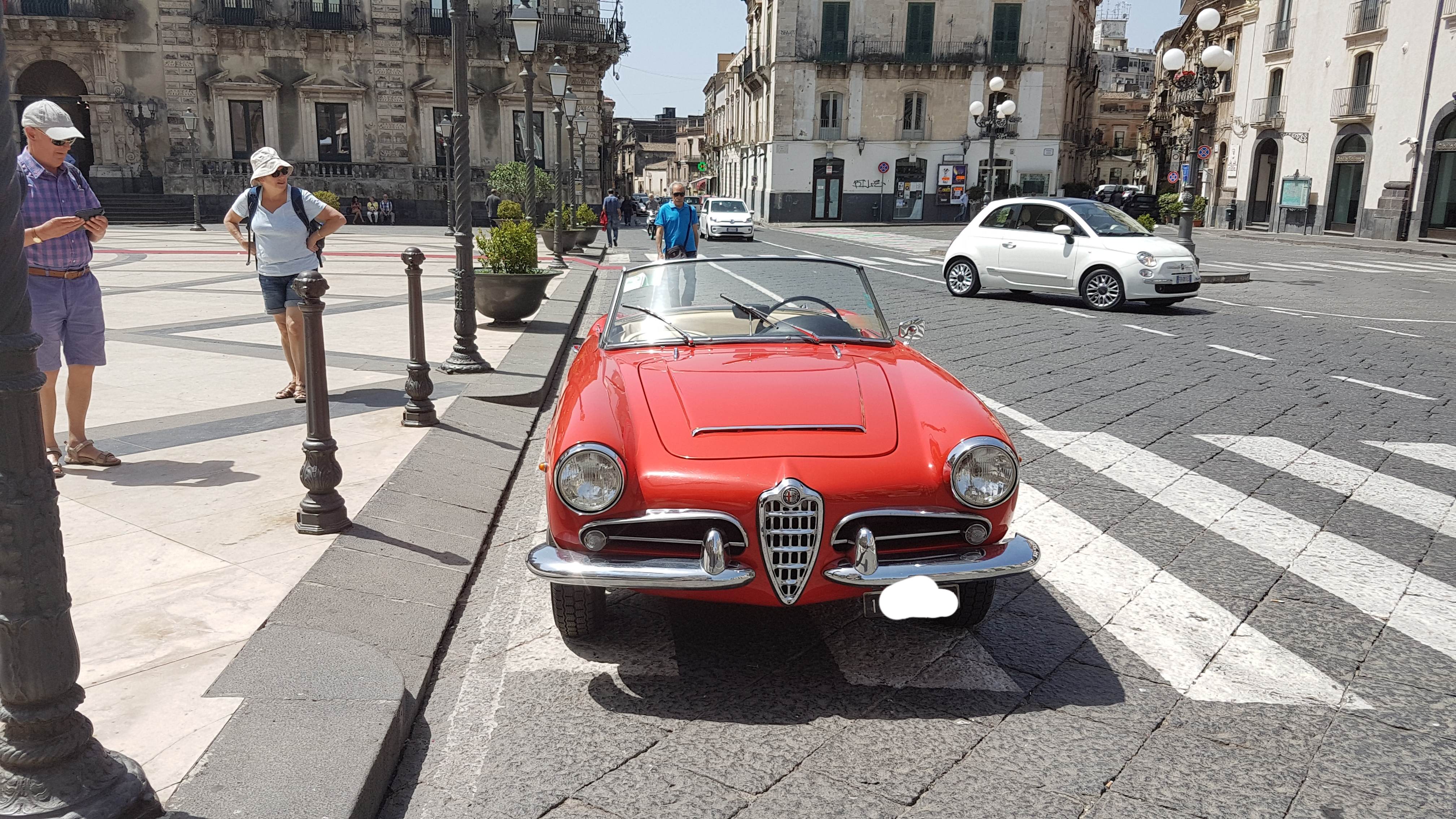 Era un ragazzo sui 40-45 anni, abbiamo scambiato due chiacchiere, ha visto che stavo fotografando la macchina. Ha detto che è del 1964, comprata credo da suo padre (non ne sono certo, però), poi auto che è rimasta tanto tempo in garage, senza fare troppi km. Ha detto che è stata solo lucidata ma le vernice è originale. La prestava ad un amico per il matrimonio, per fargli fare forse delle foto. Sabato mattina in piazza del Duomo di Acireale, splendida, c’erano due matrimoni. Gli ho detto che deve essere un amico veramente fraterno, per prestargli quella macchina :)