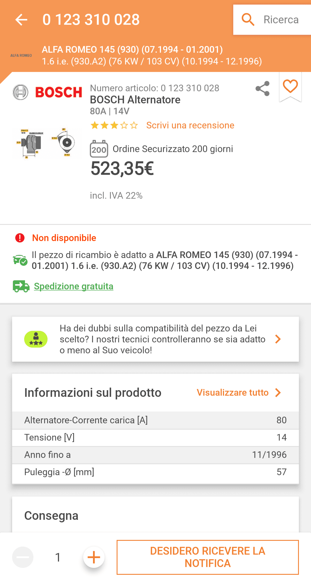 Sto avendo difficoltà a trovare l'originale Bosch codice 0128310028. Nuovo inscatolato in qualche fondo magazzino.