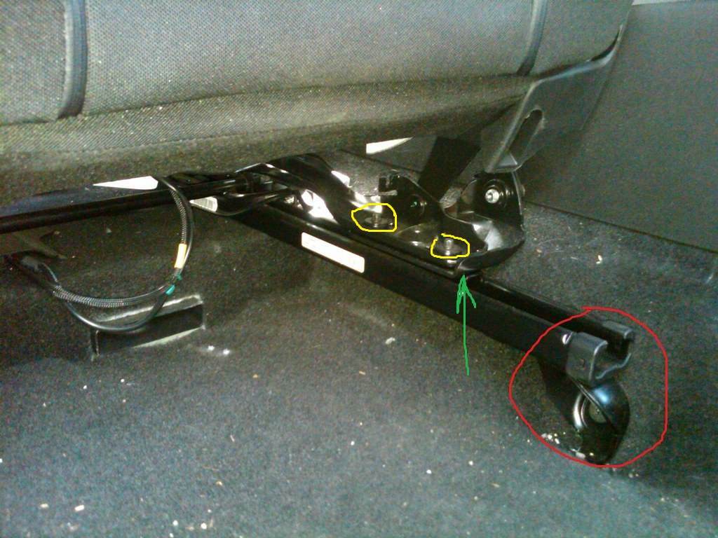 Prova a fare così : Levi il sedile dalle guide, sbulloni da sotto dove ti ho segnato in giallo e dove ti ho messo la freccia verde metti gli spessori (rondelle?) fino a quando NN trovi l'altezza più adatta. Probabilmente dovrai procurarti dei bulloni più lunghi x ancorare nuovamente il sedile alle guide.