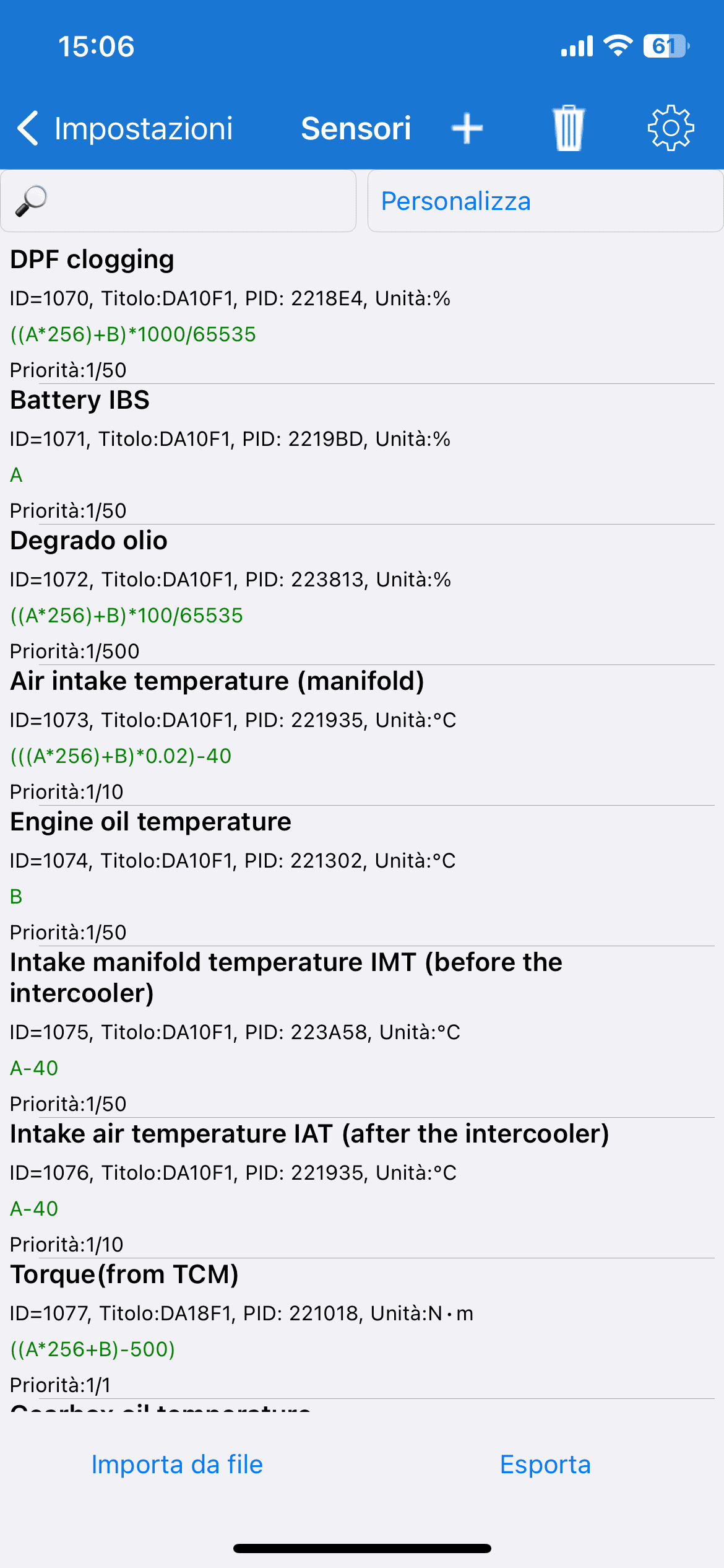 - alcuni PID su header DB33F1 sono doppioni di quelli che già sono disponibili nei sensori di default dell'app, io li uso perché sui sensori personali è possibile definire con che cadenza leggerli e personalizzare scala e testo
