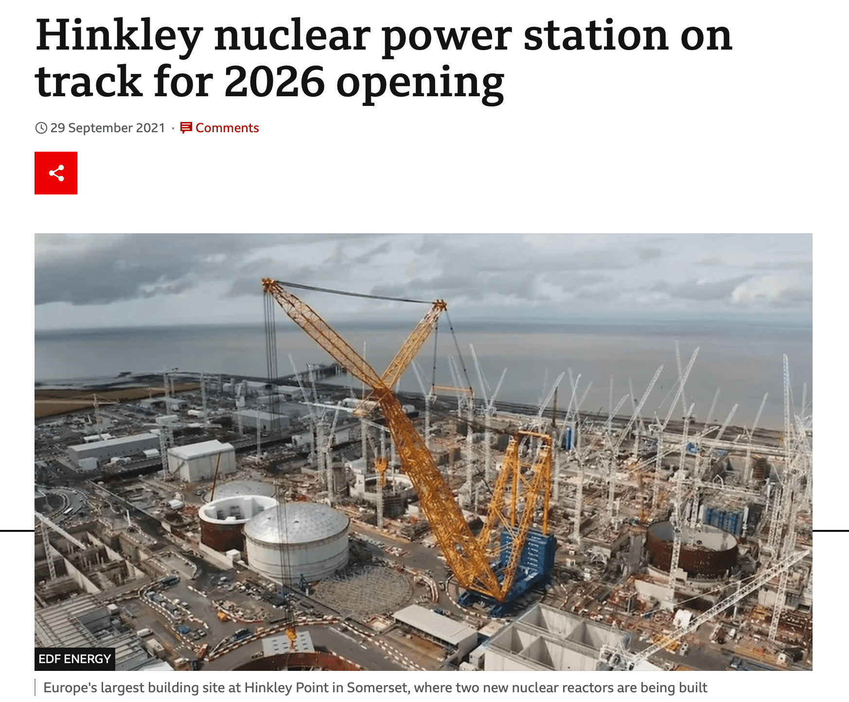 nel Regno Unito stanno costruendo 2 nuove centrali nucleari con tecnologia franceseplot twist, 1kwh di energia elettrica prodotta in germania ha emissioni 10, DIECI volte superiori ad 1kwh prodotto in francia, perché la francia è il paese al mondo con il più largo uso di centrali nucleari e la germania ultimamente ha riattivato centrali termoelettriche a carbone per far fronte al insufficienza delle fonti rinnovabili e al impennata di prezzi del metano, mentre il carbone lo estraggono sul posto con enormi miniere a cielo aperto e il macchinario semovente terrestre più grande del mondo