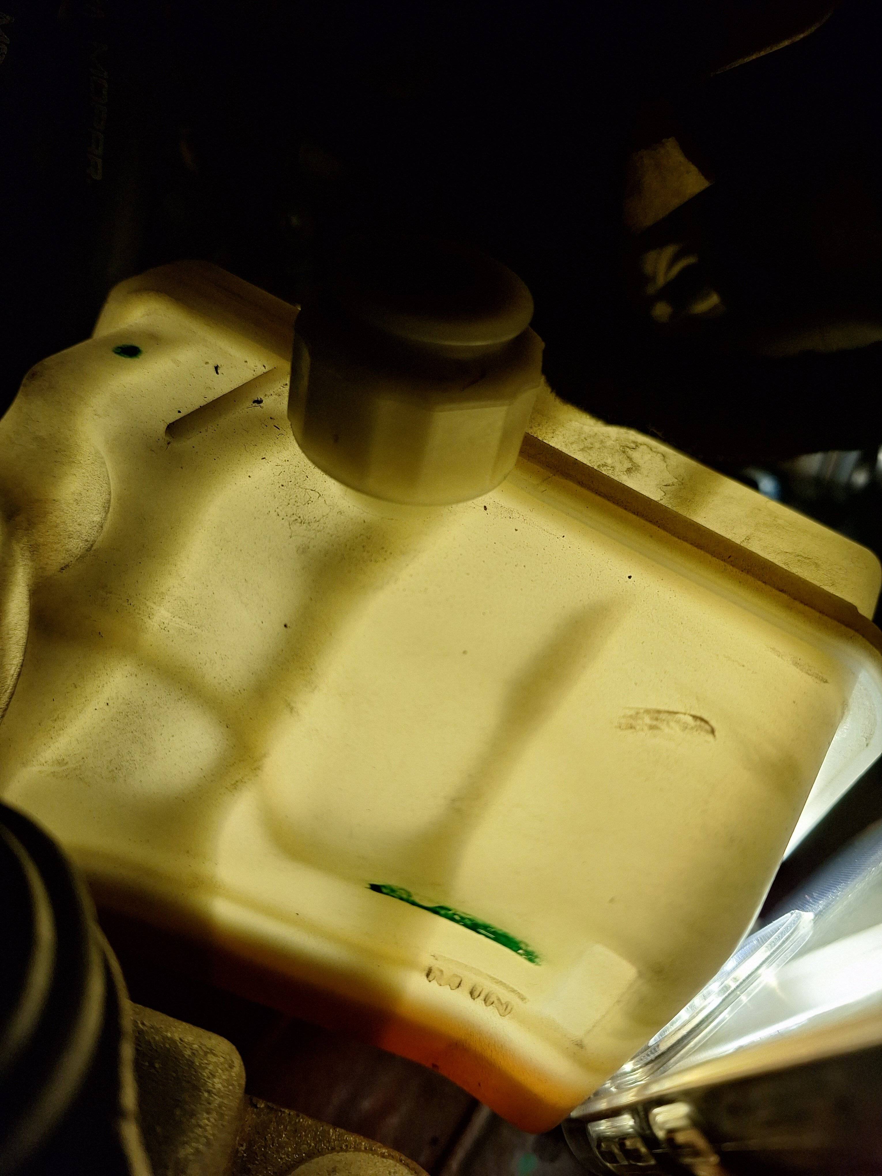 Metto qui la foto della mia vaschetta fatta con il livello basso a macchina appena spenta (considera che io ho rabboccato portando il livello a "freddo", che prima era vicino al minimo, fino al segno verde):