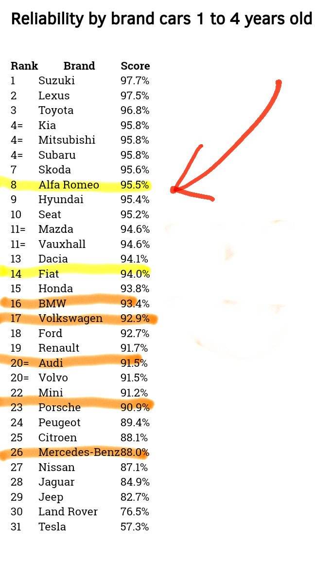 Come mio secondo post, dopo il saluto, segnalo la classifica di affidabilità per marca stilata dal sito inglese whatcar.com, sulla base di 18mila interviste. La classifica dell'Alfa Romeo si basa essenzialmente su Giulia Giulietta e Stelvio.