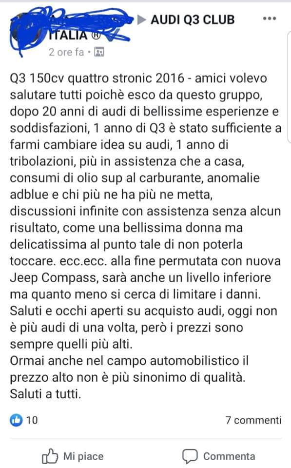 per non parlare della T-ROC o come cacchio si scrive: un carissimo amico friulano, crapa di pietra, che guida come un tassista di Oslo. nuova di pacca, due mesi con cambio fottuto. auto ferma in concessionaria con palleggio infinito di responsabilità tra concessionario e casa madre. si badi: in totale e assoluta garanzia! cosa c'entra il cliente? e insiste....