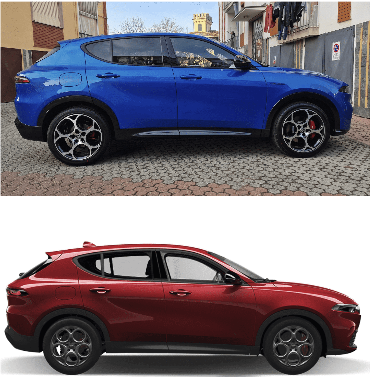 Non solo : sotto i proiettori, nella mia (blu, reale) la plastica sporge di qualche cm rispetto al taglio di questi, mentre sulla rossa no...termina praticamente quasi a filo.