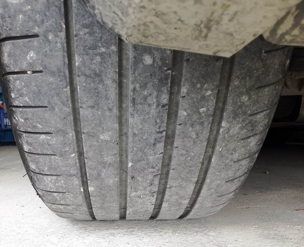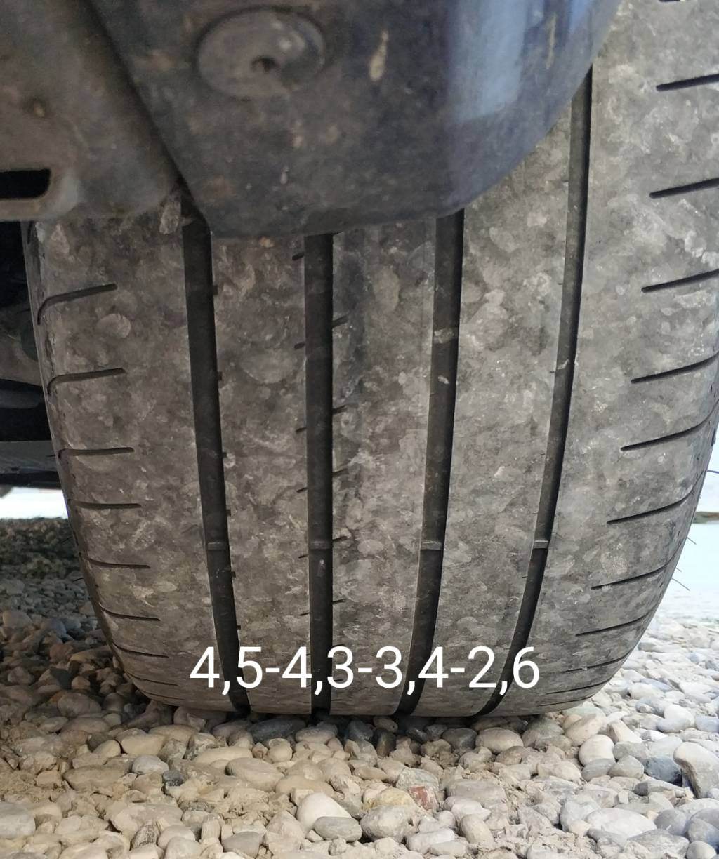 Posteriori 2,2 - 2,3 a freddo come da libretto manutenzione poi a caldo 2,6 - 2,7 rilevato dai sensori tpms la sinistra è uniforme ma questa è consumata troppo all'esterno la scanalatura più esterna è quasi arrivato al tassello di controllo.