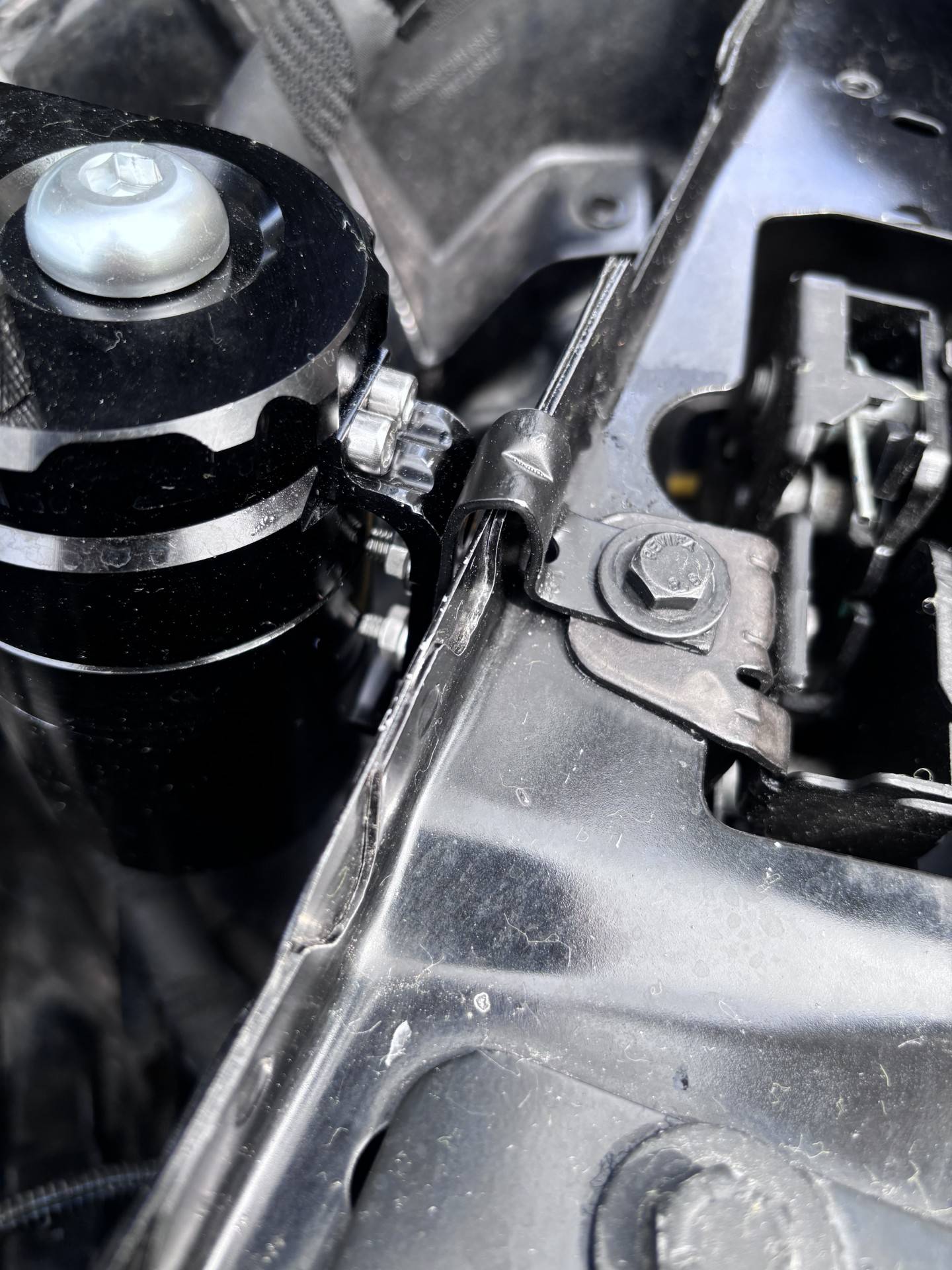Ho pensato di collegare il serbatoio utilizzando il perno dello sgancio cofano lato guidatore, in questa posizione viene facilissimo svitarlo e sono riuscito ad evitare ogni tipo di strozzatura. Ovviamente ho dovuto sagomare e approntare appositamente una staffa in acciaio, ecco i dettagli: