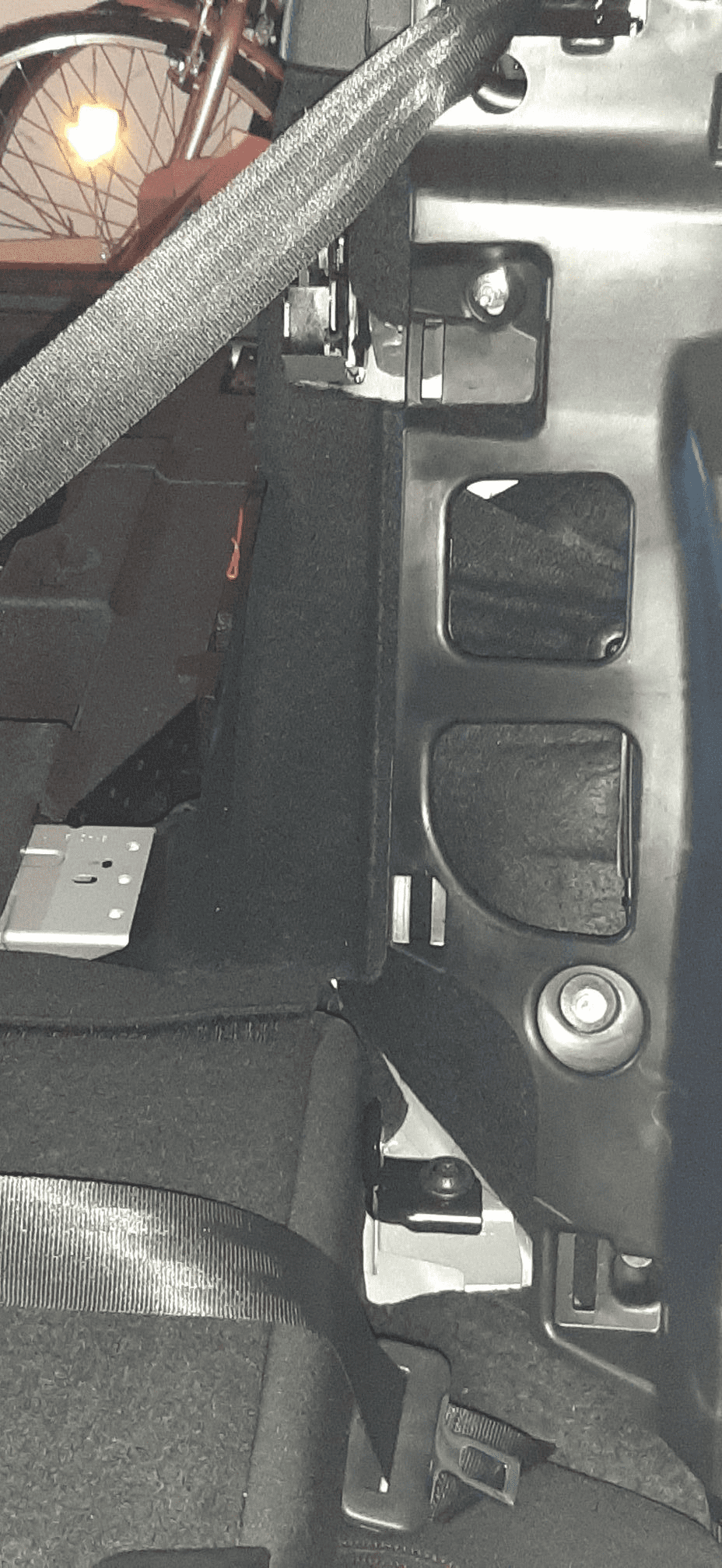 Al posteriore, si toglie completamente o anche quasi completamente il battitacco che risale fino al divanetto. La vite torx è sotto la levetta di sgancio del sedile. La parte di schienale dalla quale esce la cintura di sicurezza va semplicemente tirata con forza a sè ed esce tutto: