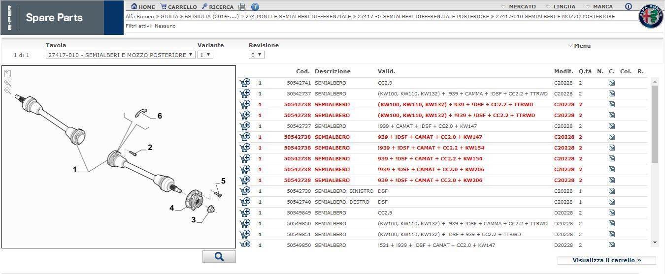 avevamo guardato un po' di tempo fa con i codici eper, praticamente solo le 200cv benzina non q2 e le diesel manuali non q2 montano i semiassi "normali", tutte le altre hanno gli stessi semiassi "rinforzati", la quadrifoglio invece ha dei semiassi specifici.I semiassi cambiano perché per forza di cose devono poter essere in grado di poter gestire la maggior potenza nella singola ruota.. Mi pare che la benzina Q2 monti i semi asse delle normali diesel.. Se non sbaglio eh..