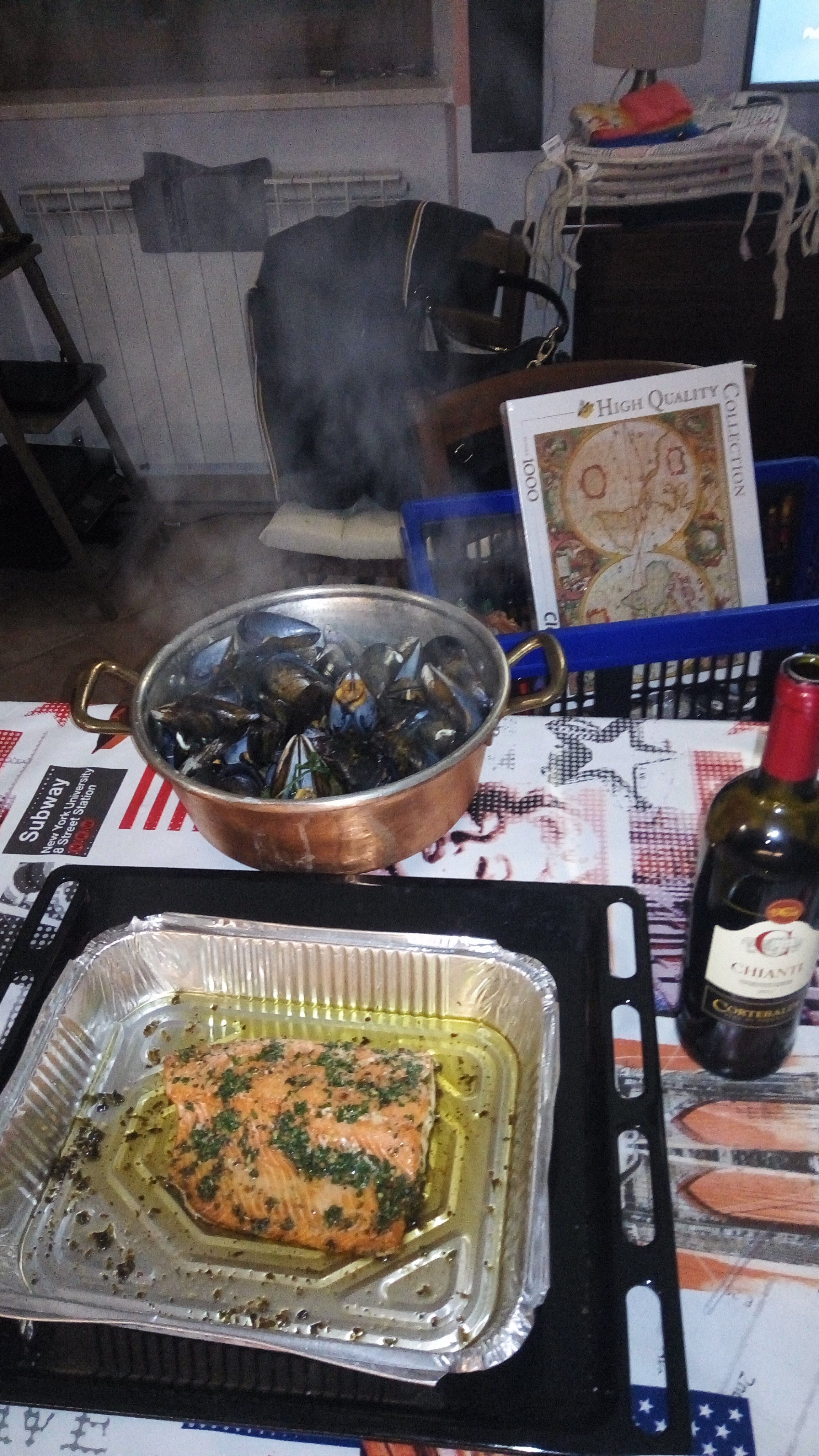 Ottimo!sempre un grande cuocoPepata di cozze (da notare il fumo), trancio di salmone arrosto e del buon Chianti!!!!