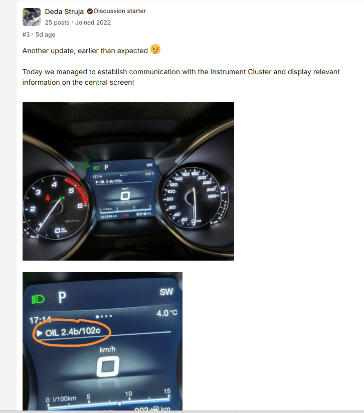 Per il tema prevenire è meglio che curare, pare che comunque un utente croato stia lavorando (con successo) alla visualizzazione della pressione olio su schermo centrale.. Credo abbia capito come interpretare i parametri ricevuti dalla ECU.