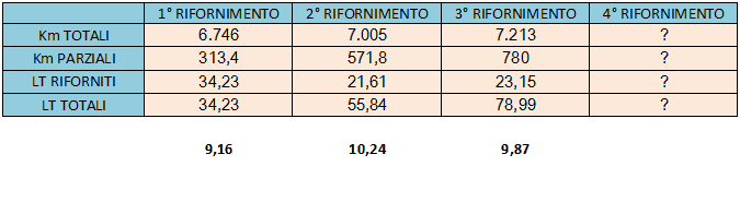 Riguardando la tabella esempio di RadolphCarter mi sono accorto che nel primo rifornimento vengono compilati tutti e 4 i campi e non solo 3, e tenendo conto solo gli ultimi 3 rifornimenti mi viene questo risultato: