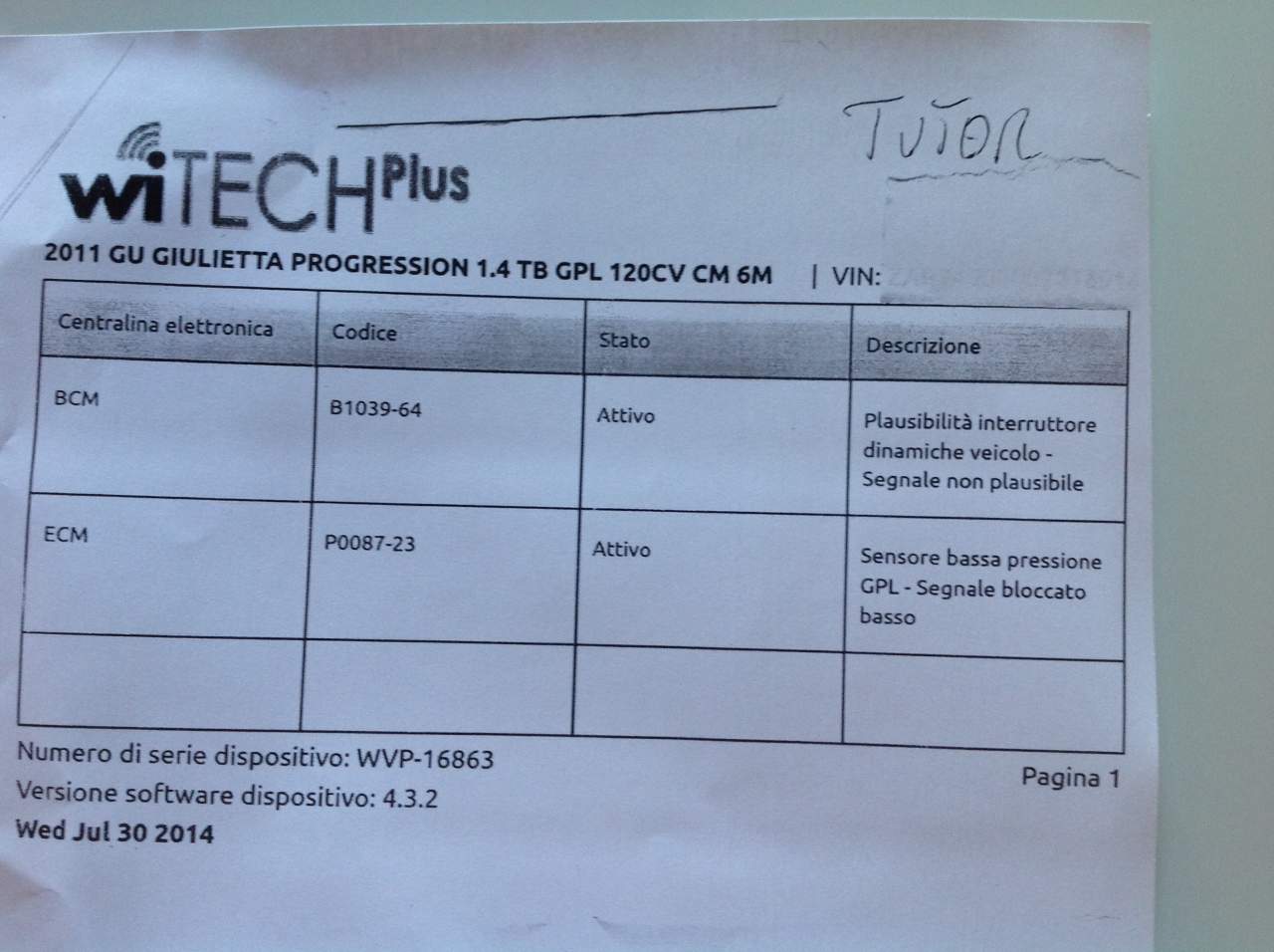 2 nella prenotazione per il tagliando (per il 19/8) mi hanno inserito una dicitura "service news errore p0087 tutor" cosa significa?