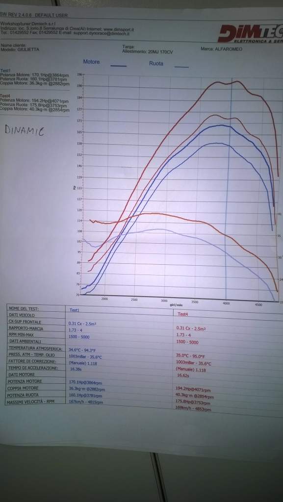 Ciao ragazzi, oggi finalmente mi sono deciso di portare la Giuly da Carburatori Bergamo (uno dei pochi con banchi prova 4X4) per una mappa soft..per iniziare abbiamo fatto due belle rullate da originale una in Dinamic e una in normal e sorprendentemente nonostante il gran caldo in Dinamic ha misurato 170CV tondi tondi e 355NM di coppia (addirittura un po di piu del dichiarato). Pensate che una Honda Civic 1.8 benzina da oltre 140 CV dichiarati ne ha rullati 126 e un Bmw 123D da oltre 200 a banco ne ha dati 186...comunque dopo siamo passati alla mappa, praticamente in Normal l'ho lasciata originale, solo un briciolo di reattività in piu in basso giusto per avere un po piu di spunto nei sorpassi mentre in Dinamic con una mappa molto soft sono passato a 400NM di coppia e ben 194CV:eclipsee_Victoria: