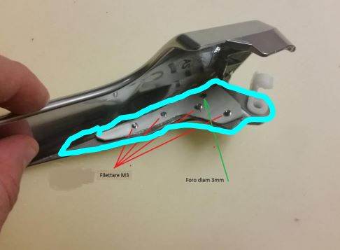 Ho provato, ma non funziona. Comunque per capirci, dalla miniatura dove ho tratteggiato con la linea azzurra, ho sagomato una linguetta di acciaio di 2mm. Con fori per rivetti e foro passante per perno maniglia. Di sicuro li non si romperà piu.