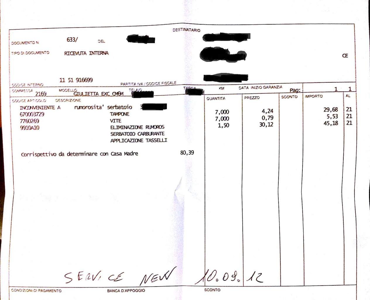Scusate l'attesa ma torno ora da lavoro... aggiungo due info che ho avuto ricontattando l'amico "deriso" del concessionario che mi ha spiegato che il serbatoio è fissato sulle lamiere ma ci sono delle viti e dei tamponi (così c'è scritto in fattura) che vengono sostituiti. In fondo alla fattura che vi ho postato c'è una scritta "service new 10.09.12" che (sempre il concessionario) mi ha dato (su mia richiesta) nel caso qualche concessionario alfa non fosse a conoscenza dell'intervento. Detto ciò ecco la fattura (ho oscurato dei dati per privacy)....che aggiungere spero di esservi stato utile e come vedete non serve un serbatoio antisismico... a buon intenditor poche parole