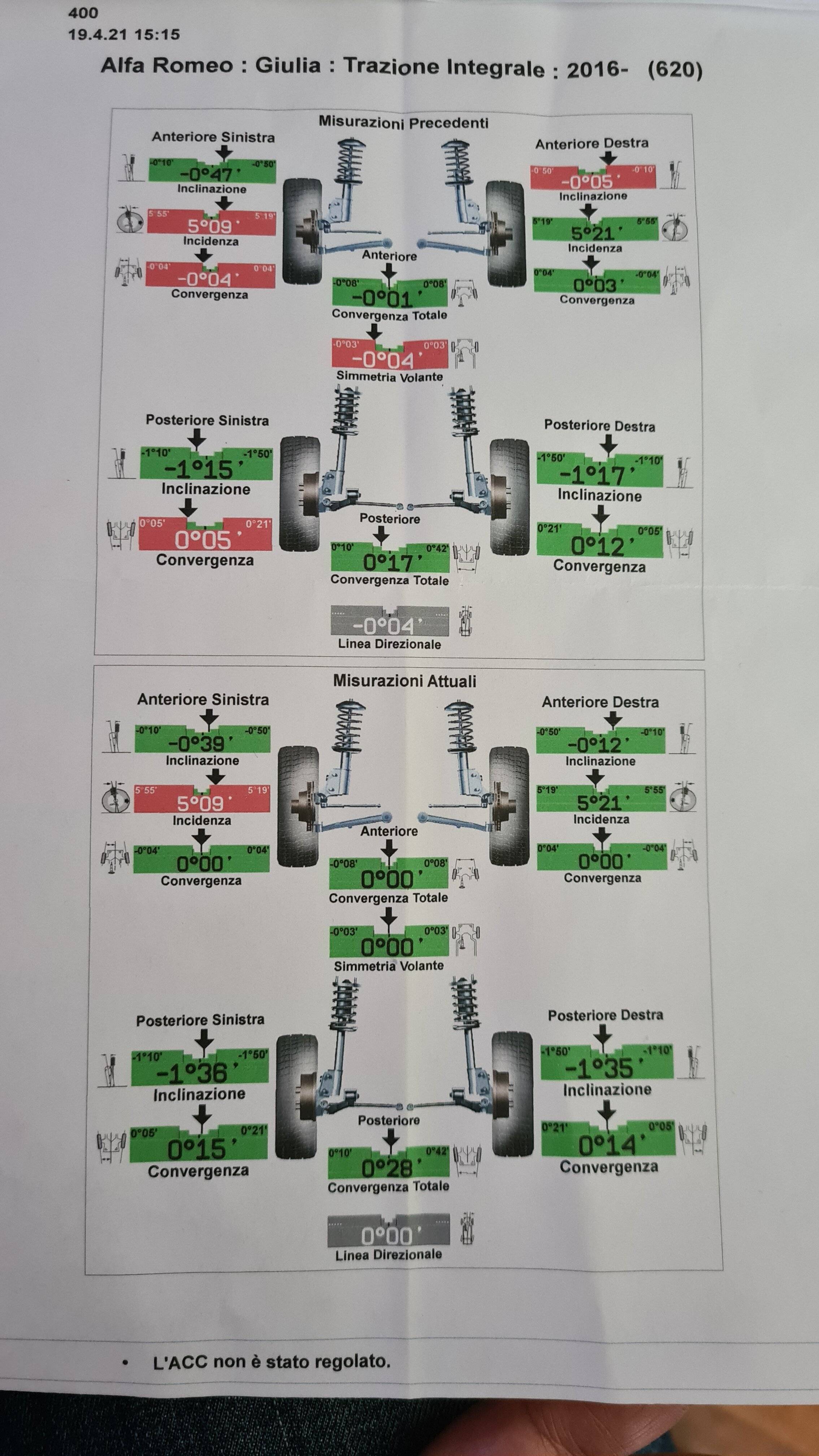 Visualizza allegato 220473questo è il risultato, fortunatamente ho trovato disponibilità e soprattutto sapevano dove mettere mano, non è stato precisissimo, avrei voluto che mi mettesse i valori esattamente a quelli di riferimento ma data la disponibilità a sistemarmi la macchina non sono stato pignolo per far mettere i valori precisissimi. Però ora la macchina la sento benissimo non ho nessuna sensazione come se la macchina non fosse a posto e anzi posso finalmente apprezzare la precisione di guida. È rimasta solo l'incidenza della ruota anteriore sinistra non nel range di valori, ma credo che sia trascurabile che ne pensate....?
