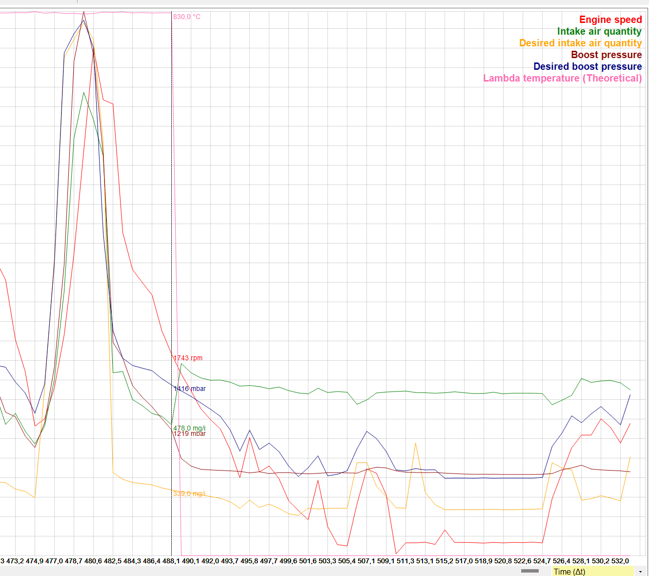 This is the fault in Multiecuscan, when easing off (coming to a ramp on a highway). MAF value goes up, but MAP does not -> Error. Vertical line is where to engine goes to limp mode.