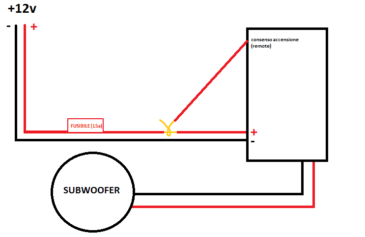 Schema: +12V_____|FUSIBILE 15A|______+ Amplificatore