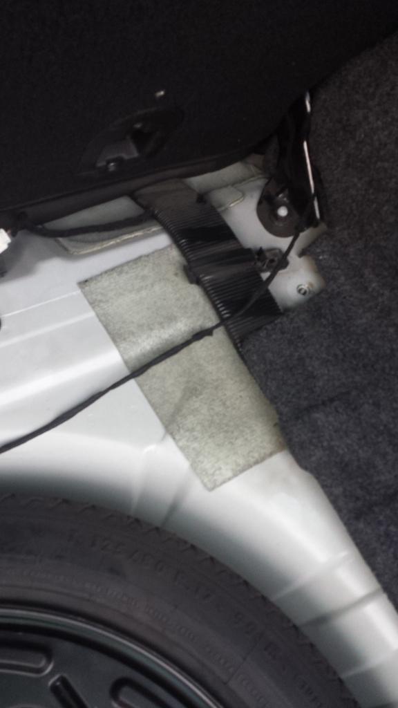 Verificato che è tutto funzionante, nastrate tutto il cablaggio con il natro telato e fate passare il cavo fissandolo nella canaletta in plastica che percorre il vano ruota fino al sedile posteriore.