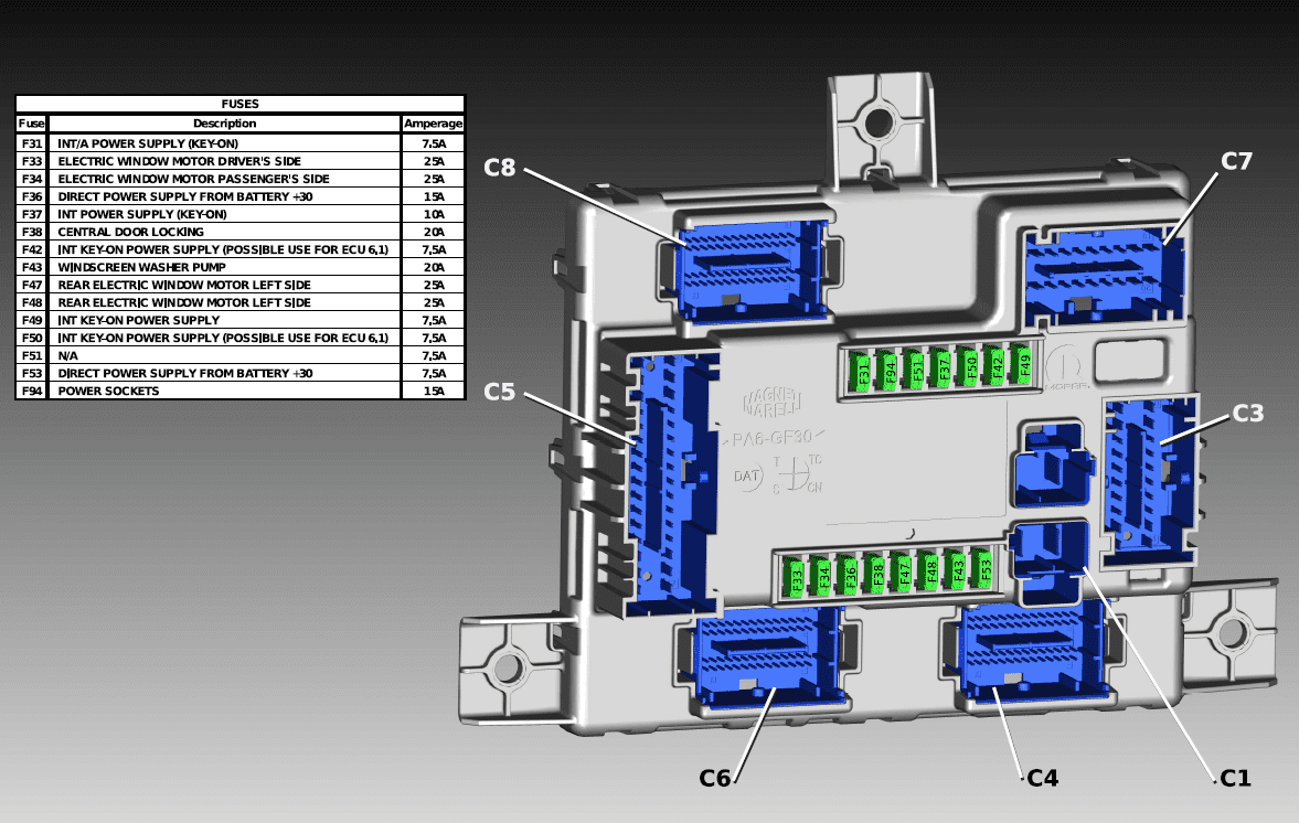 Vedo lo schema. E per verificare basta poco, un tester settato su 20V in continua, puntale nero su un bullone e puntale rosso sulla parte accessibile del fusibile (a macchina spenta), e si vede subito