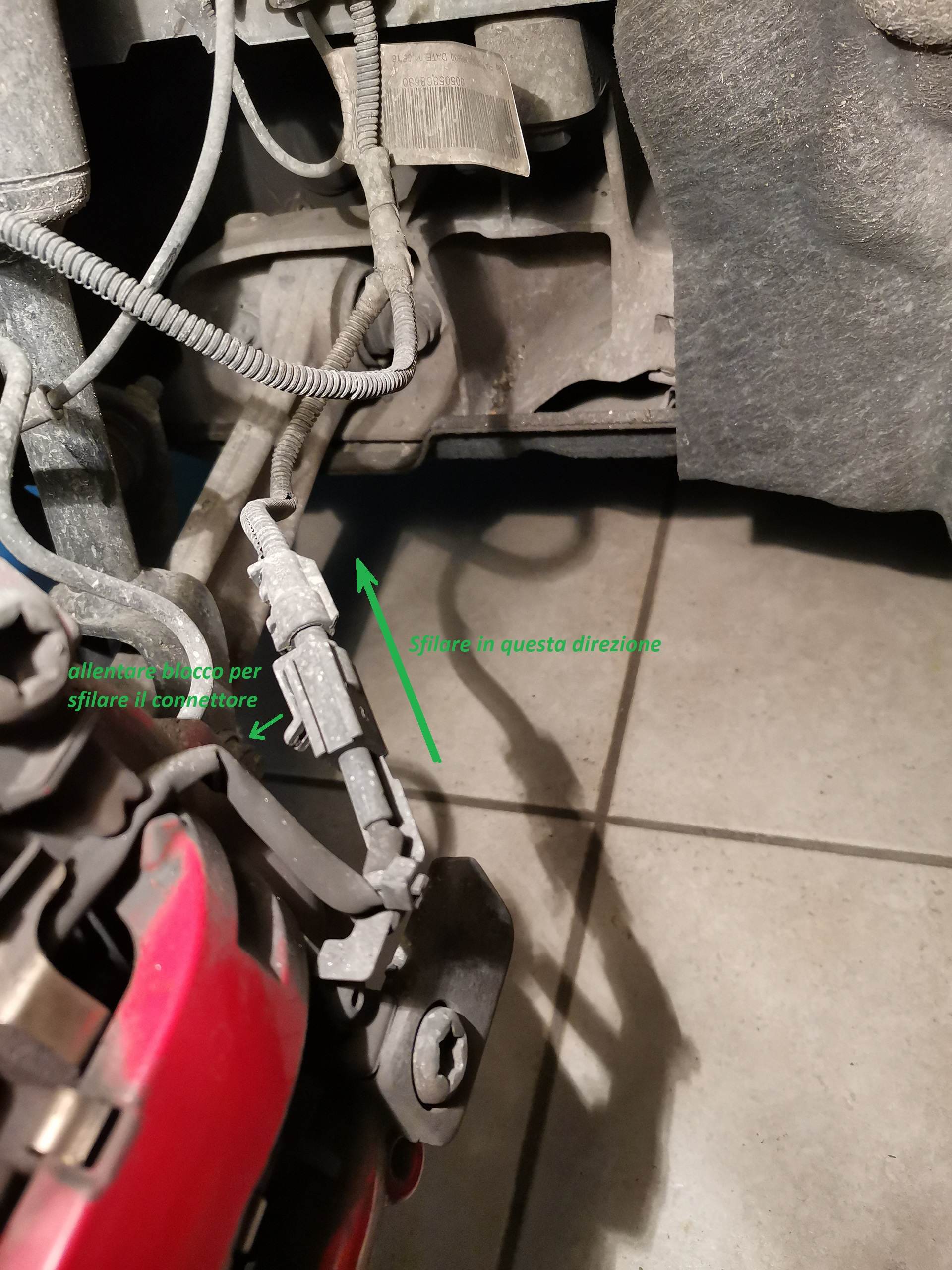 Adesso si deve disimpegnare il connettore del sensore usura pastiglie e, dopo aver tagliato la fascetta di sicurezza, sfilare il connettore della pastiglia dal suo supporto secondo la freccia in foto