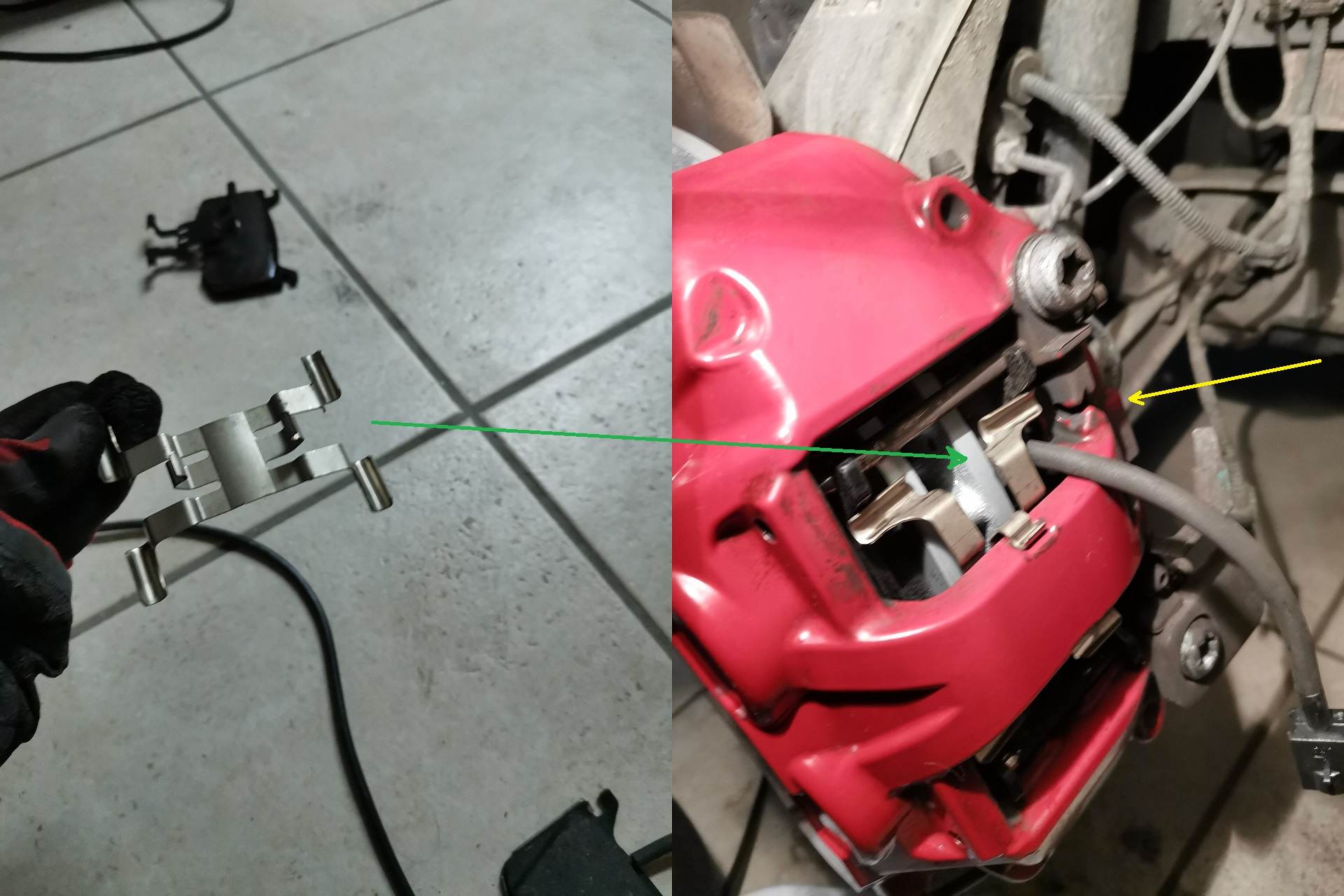 Dentro la confezione delle pastiglie (nel mio caso delle FERODO) vi erano le molle nuove (vedi sotto) e vanno messe dentro le pinze prima delle pastiglie nuove e sostituiscono le precedenti. PS: attenzione che le pastiglie col sensore hanno un verso per la rotazione stampigliato sopra, va rispettato quando le reinserite nelle ganasce e il filo del sensore va passato come in foto e incastrato poi nell'incavo come da freccia gialla.