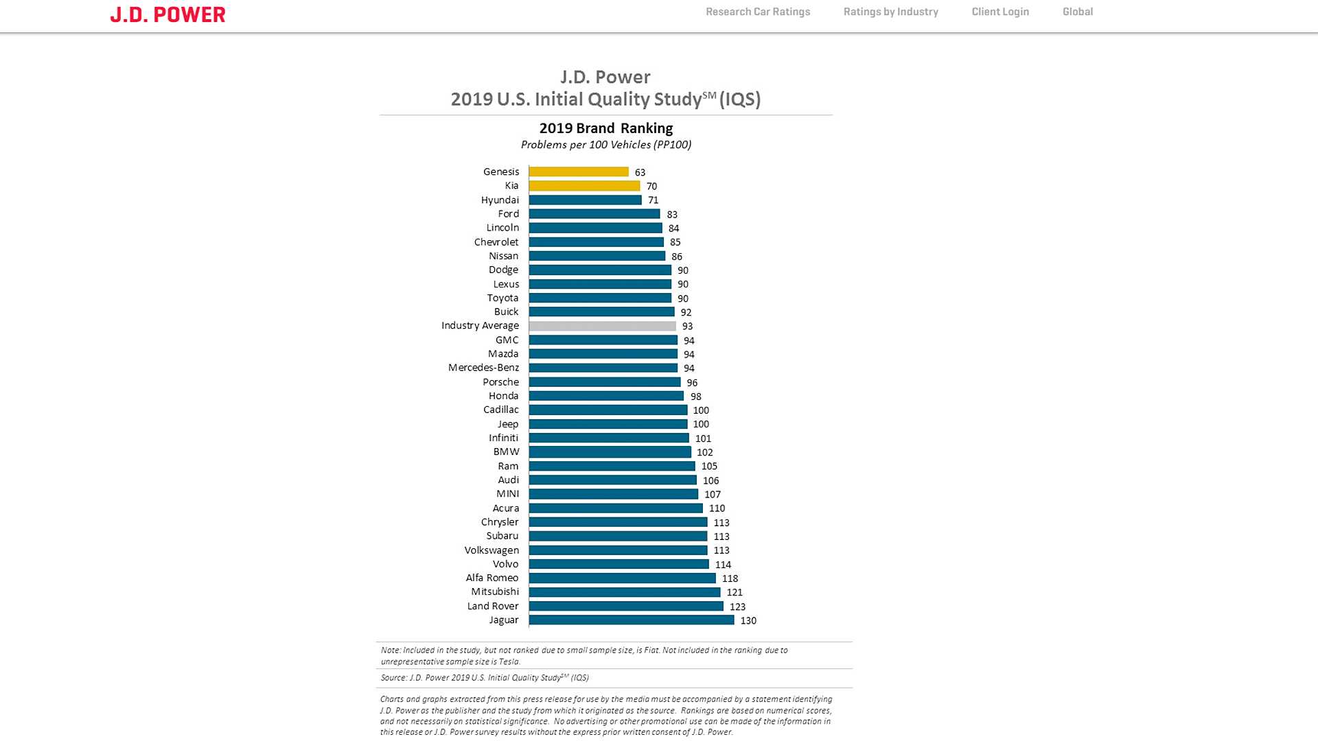 The firm’s annual initial quality rankings are based on survey responses from new car buyers or lessees of current model-year vehicles who respond during their first 90 days of ownership.