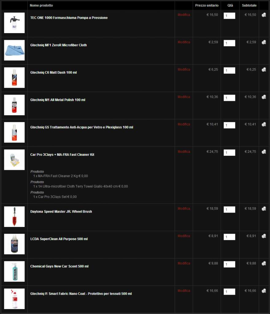 allora fai una base di prodotti seri poi inizia a prendere gli speciali...cmq per i vetri gtecnic ottimo ma consiglio se hai la lucidatrice prendi tutto carpro...così lo lucidi con la lucidatrice e viene perfetto....