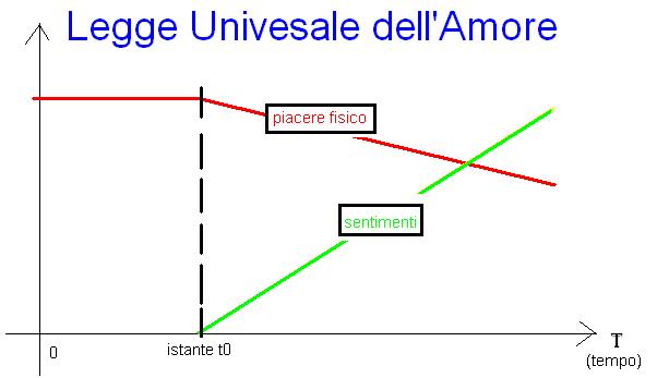 Dopo averci riflettuto tanto, ho trovato la legge matematica dell'amore: all'istante 0 due individui si incontrano e si piacciono di una quantità cost. di "piacere fisico" (curva rossa) fino all'istante t0. Superato questo periodo di tempo t0, i due individui (se ancora stanno insieme) cominciano ad innamorari con legg...e lineare e crescente (curva verde) che raggiunge il suo massimo nel punto di minimo del piacere fisico (dimostrabile con il principio di min-max o con le derivate parziali)