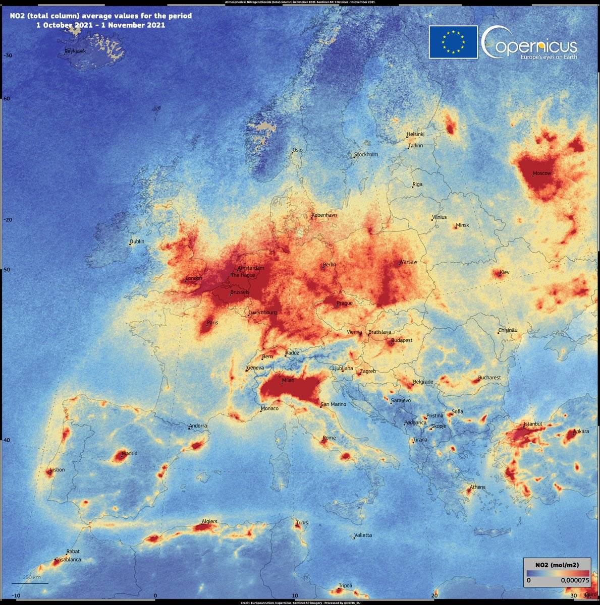 La geografia della pianura padana è terribile purtroppo, ma notare le rotte dei mercantili fra Portogallo e Nord Francia: solcano gli stessi corridoi navali lasciando una gran quantità di biossido d'azoto.