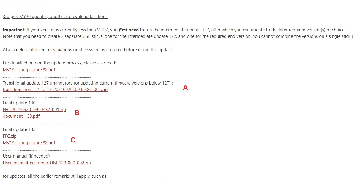Immagino che tu intenda il file zippato che ho contrassegnato con la lettera C in rosso (avendo la versione 131 la 132 ritengo sia la successiva). Il mio dubbio rimane che in alto è scritto MY20 e la mia è una MY22. Ringrazio tutti per il supporto