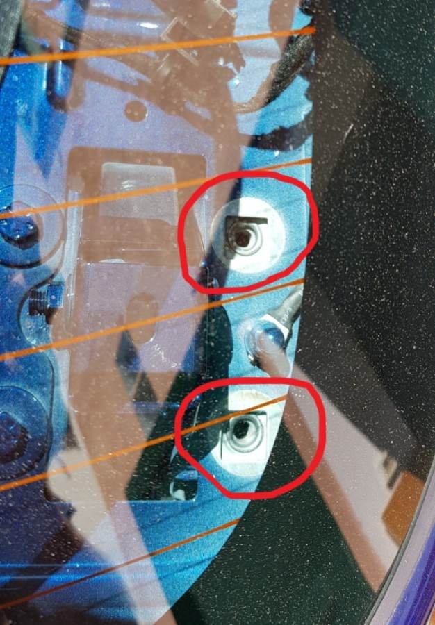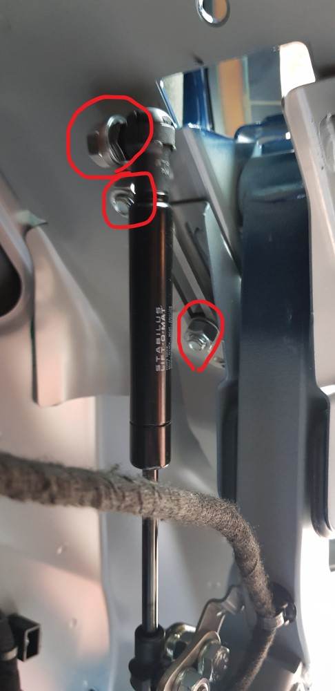 Andare dentro al baule e fissare la piastrina con l’occhiello saldo verso il davanti poi fissare la molla a gas con un dado M8 e 2 rondelle standard nell’occhiello come da foto che segue, attenzione! La molla a gas deve lavorare con lo stelo che fuoriesce verso il basso (ce il suo perché)