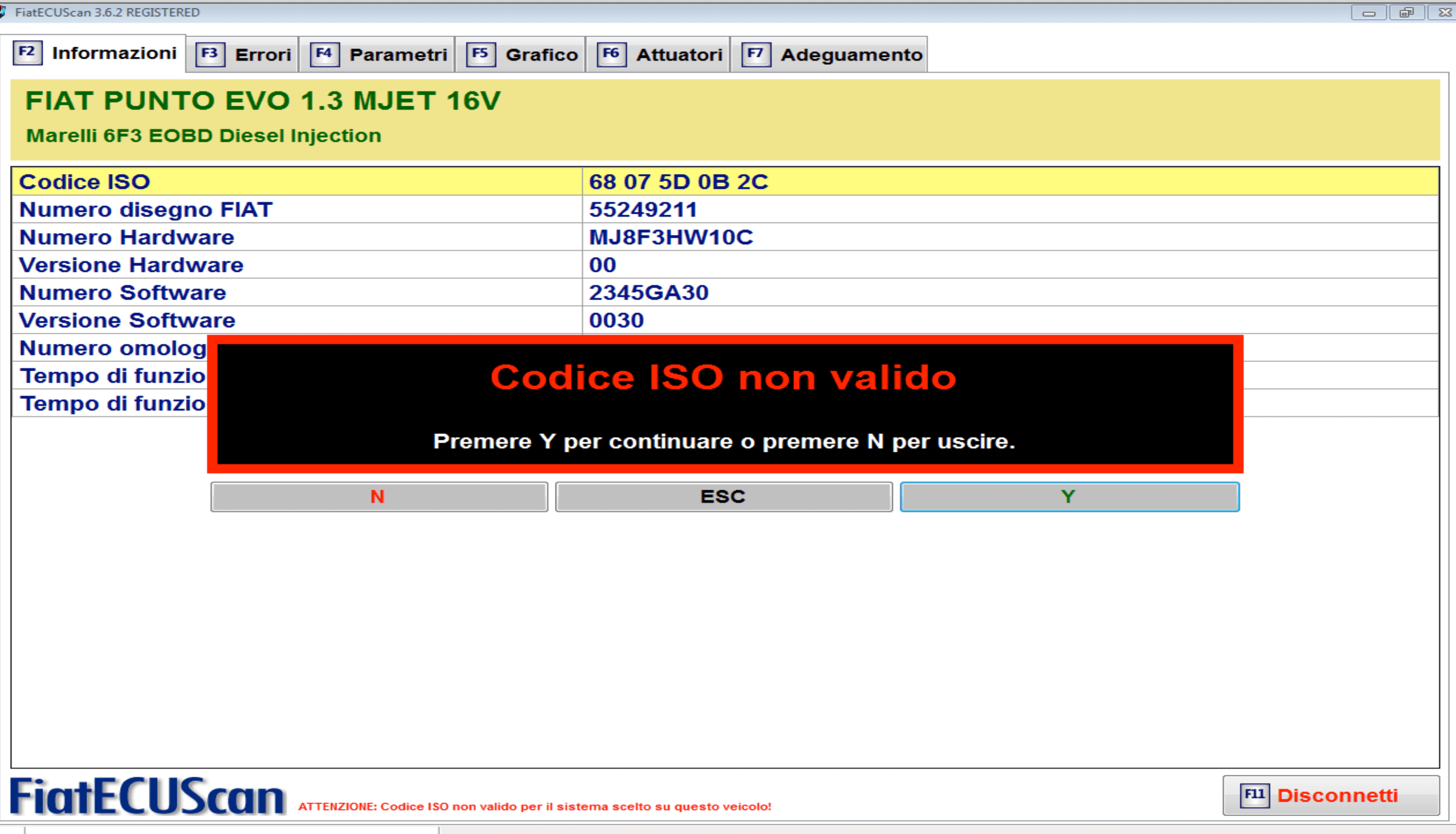 Succede anche a me la stessa cosa sulla versione 3.6.2, su grande punto 2013 mjet, faccio scansione ecu, mi rileva la centralina motore ma quando mi connetto dice "Errore iso".