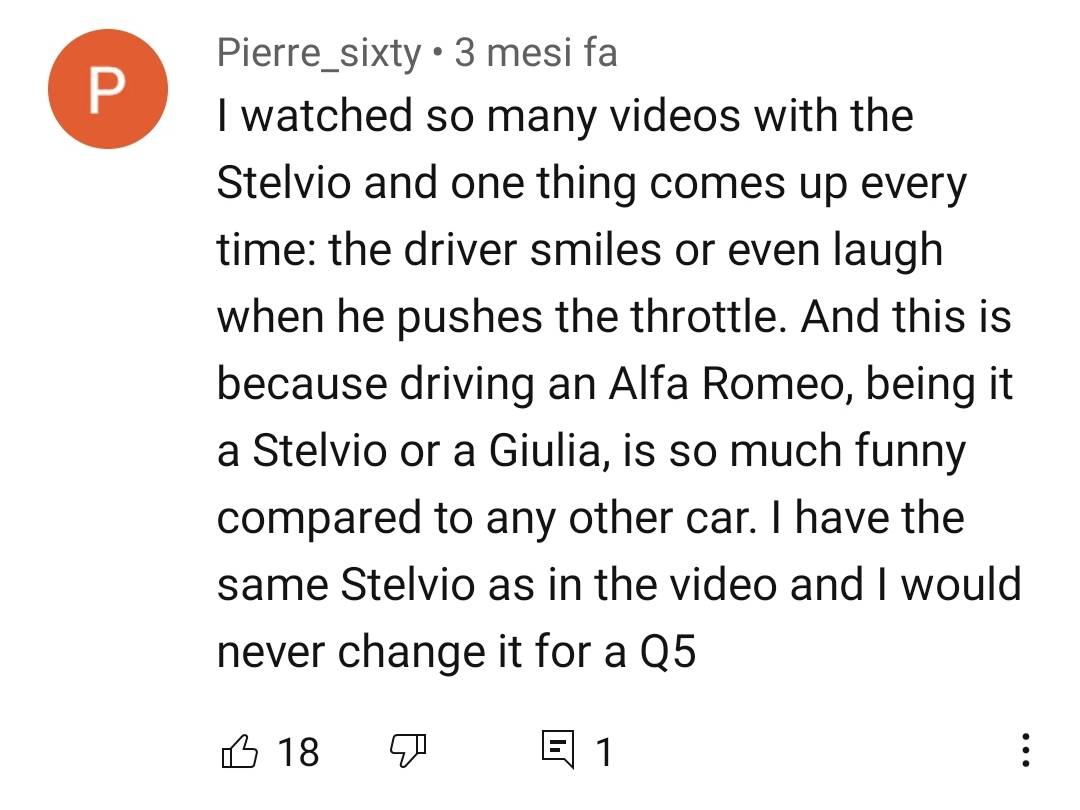 Grazie! No, di Audi ho zero nostalgia, auto care, fredde e senz'anima....ne ho avute 2, so di cosa parlo. Stelvio come linea è meravigliosa, spacca davvero, gli interni sono meno "spaziali" di Audi, ma elegantissimi e classici, con sportività accentuata sul lato guida. L'Infotainment è inferiore, ma per le mie esigenze non manca nulla, anzi.... l'insonorizzazione l'avrei curata un po' di più, ma anche così non fa gridare allo scandalo, anzi, temevo peggio quando leggevo le lamentele di qualcuno. Spero solo di aver fortuna con l'affidabilità, aspetto per il quale il fattore "C" la fa da padrone in tutte le marche, Audi compresa(non vi dico cosa ho speso per la rottura della pompa alta pressione gasolio...praticamente un rene).