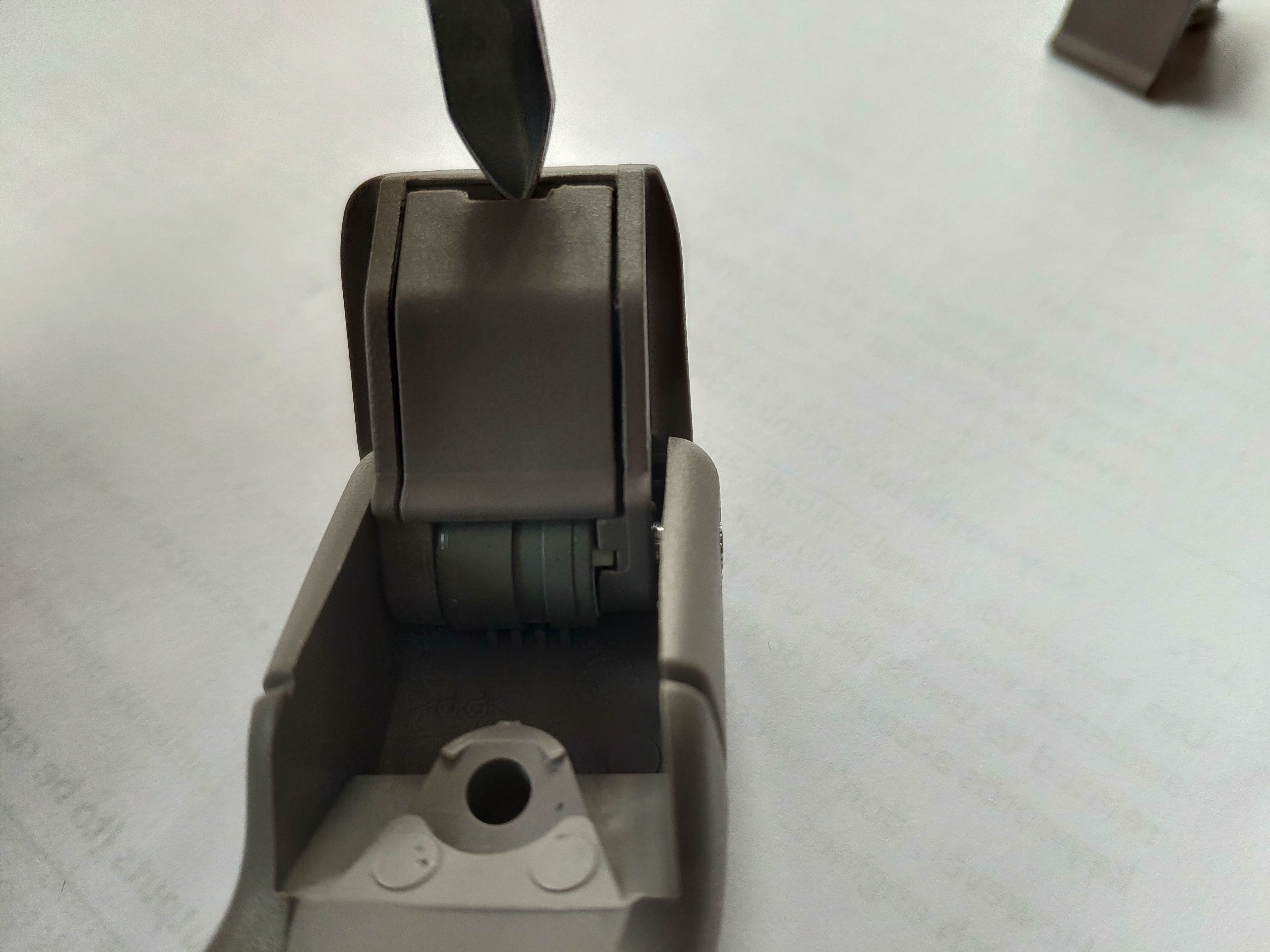Adesso prendete il portaocchiali, confrontando i suoi attacchi con quelli della maniglia, noterete che i primi sono molto meno lunghi. Io ho recuperato un po' di lunghezza "lavorando" i supporti, strappando il materiale con una piccola pinza. Un Dremel sarebbe più indicato per un lavoretto pulito, ma funziona anche così. Lavorate la parte esterna senza togliere i rinforzi che stanno alla base dei profili che si incastrano.