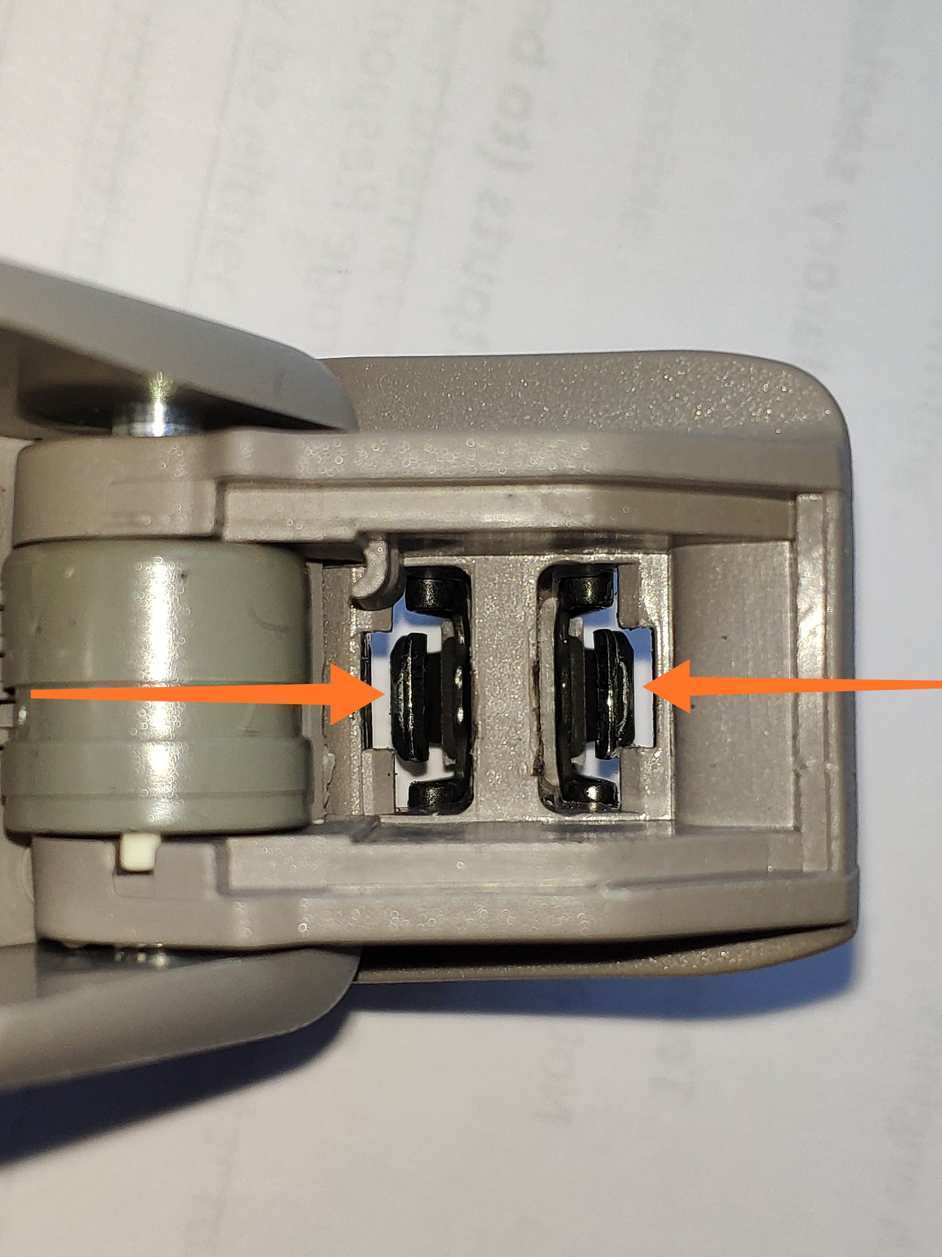 Come vedete niente viti, ma un bell'incastro a molla. Per sbloccarlo, dovete premere CONTEMPORANEAMENTE (altrimenti porchi) le due parti nere, nella direzione indicata dalle frecce. Consiglio di farlo con una pinzetta per sopracciglia (naturalmente senza dirlo alla proprietaria...). Per rendere meglio l'idea date un'occhiata a come e' fatta la parte incastrata: