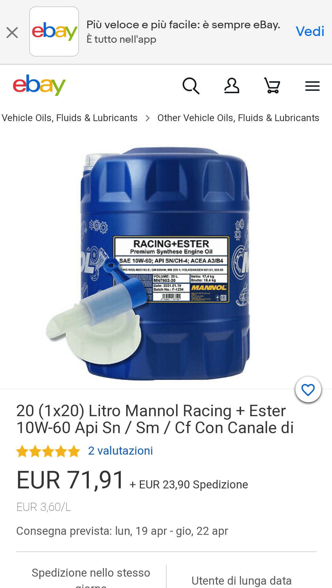 Come non mi spiego come sia possibile un prezzo del genere per un prodotto del genere. 3 euri al litro per un 10W60 dichiarato 100% sintetico con basi di Esteri.. mah.. dubbio assoluto.. chi è che ruba alla fine? Purtroppo non credo nella beneficenza e a questo mondo Nessuno Regala Niente..