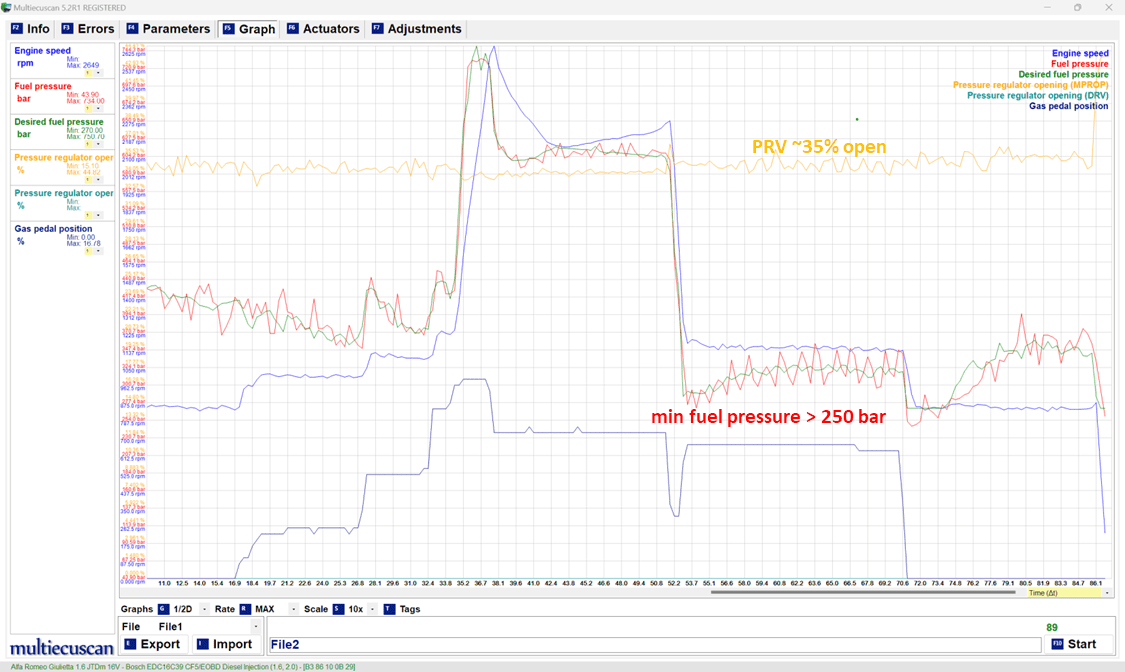 - La pressione nel rail e' molto bassa (130 bar) al di sotto del valore che registro quando la macchina e' al minino (~250 bar). I target della pressione e' in un caso 1250 bar e nell'altro 835 bar