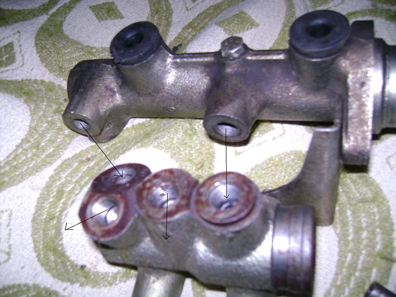 La pompa è una normale pompa a pistoncini in tandem per circuiti sdoppiati: la parte posteriore comanda i freni posteriori, la parte anteriore i freni anteriori (in foto non si vede l'uscita per la pinza ant dx, ma basta buttare un'occhio nel vano motore, le 2 uscite per i freno ant. sono adiacenti).