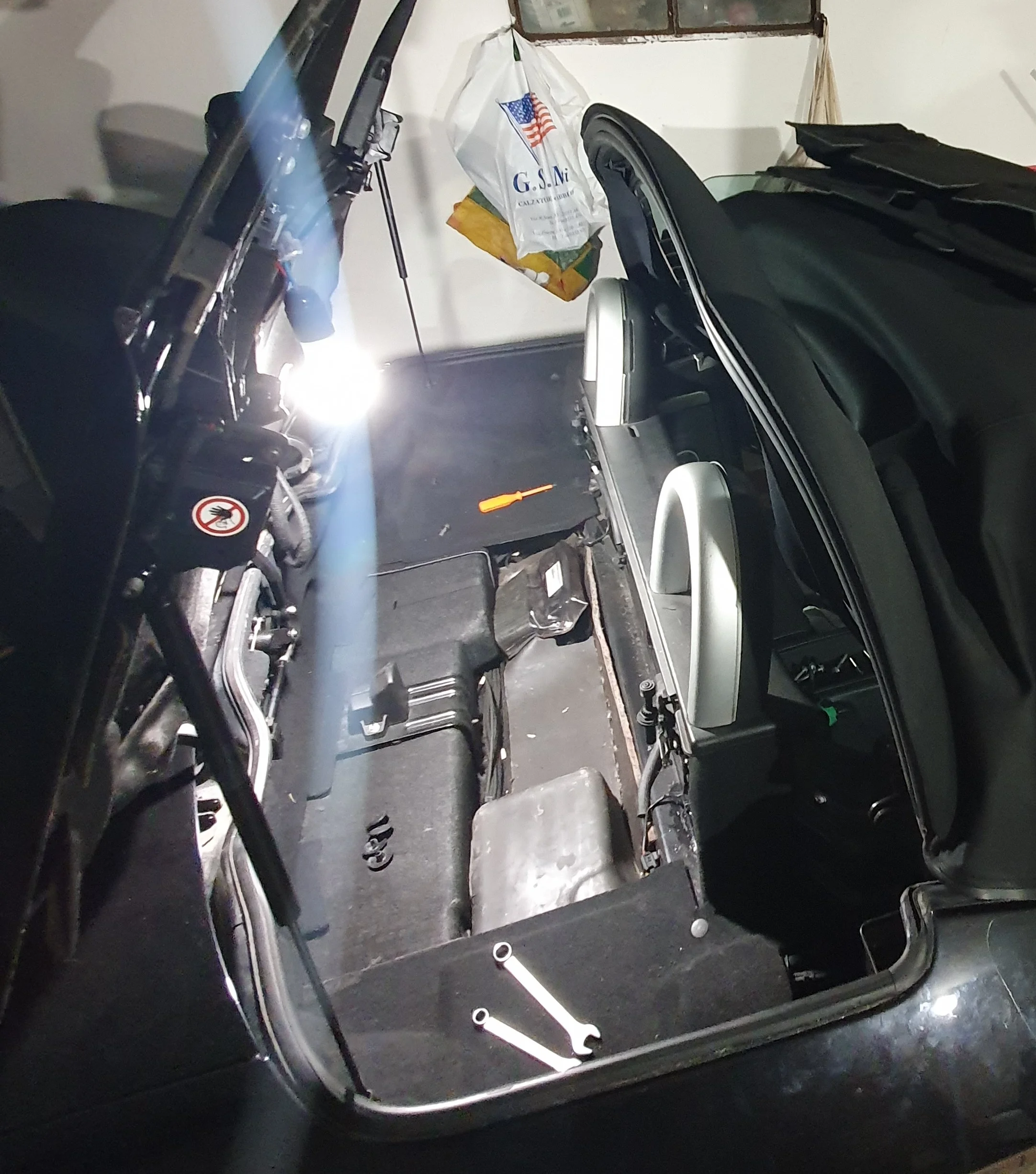 Per quanto riguarda la capote, ho visto che aveva il filo che libera l'idraulica del motorino, tirato, quindi ho pensato di aprire manualmente la capote, almeno l'arcone, per ripristinare l'idraulica del motorino.