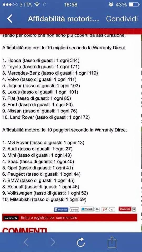 Parole sante! Anche perché, e credo sia la milionesima volta che lo dico anche in altre discussioni, in siti come questo di solito si cerca di discutere e aiutare a risolvere i problemi che si presentano sulle nostre auto e quindi è chiaro che si parla il più delle volte di problemi...è come andare in ospedale ( ennesima volta che cito l'esempio) la maggior parte della gente che è li è perché ha dei problemi ma ovviamente non significa che rappresenti lo stato di salute dell'intera popolazione.