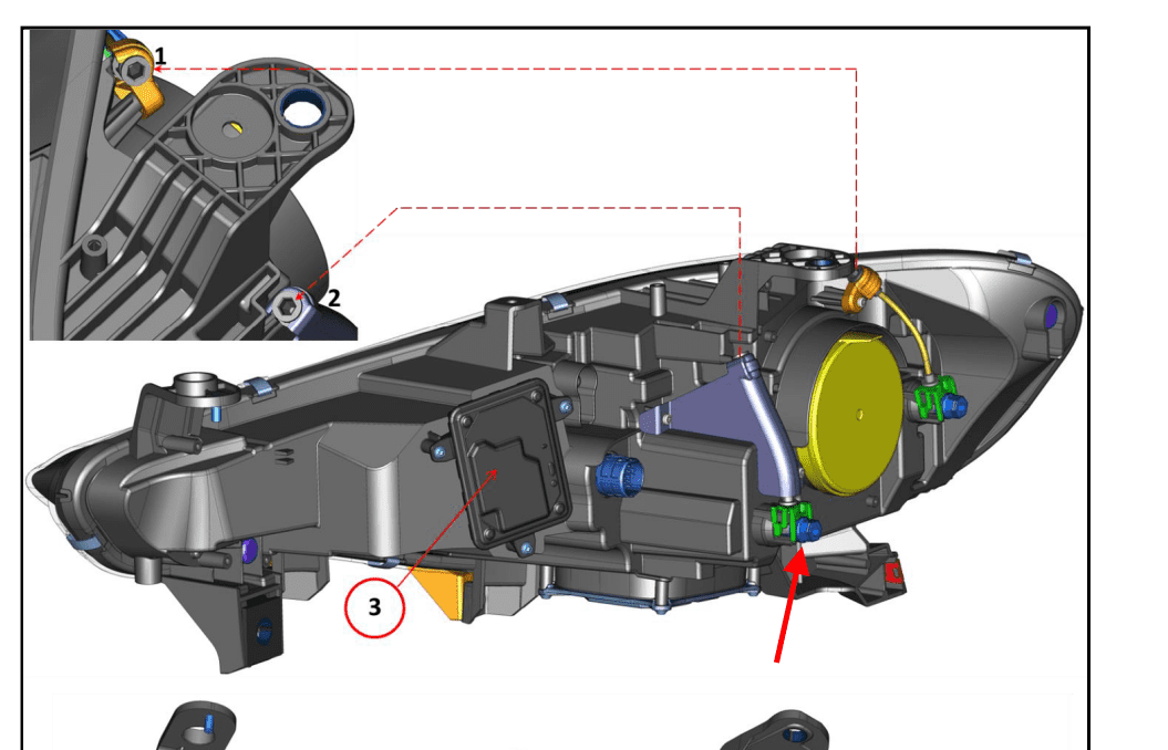 Nella mia, per regolare in verticale i fari, entrambi, sono costretto ad agire con una chiave, se ricordo è da 8, direttamente sulla vite posteriore, indicata dalla freccia in rosso nell'immagine. La regolazione orizzontale invece la faccio correttamente.