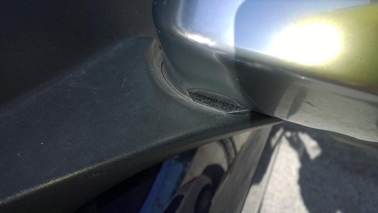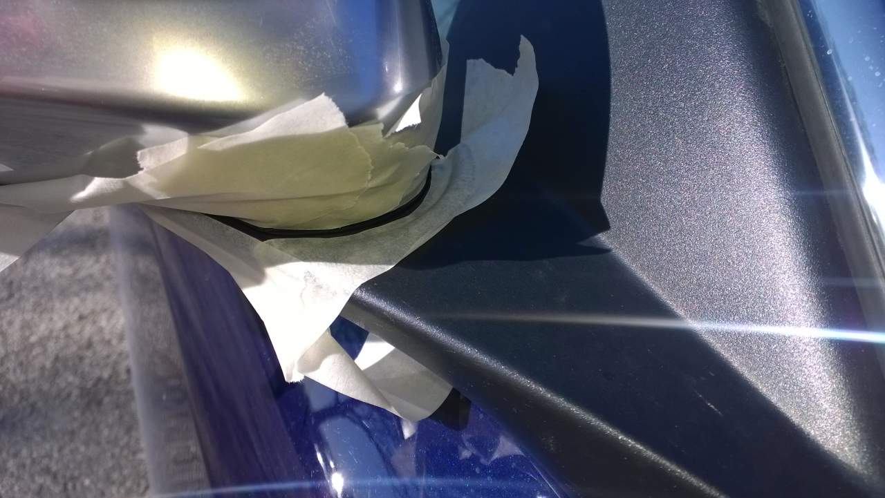 Come promesso ecco le foto. Precisamente tre; la prima con la maschera di carta gommata, nel taglio nero va messo il mastice. La seconda con il taglio che si vede nello specchietto lato guida (specchietto che non fa fruscio). E la terza con il taglio chiuso nello specchietto "difettoso", nel mio caso lato passeggero.