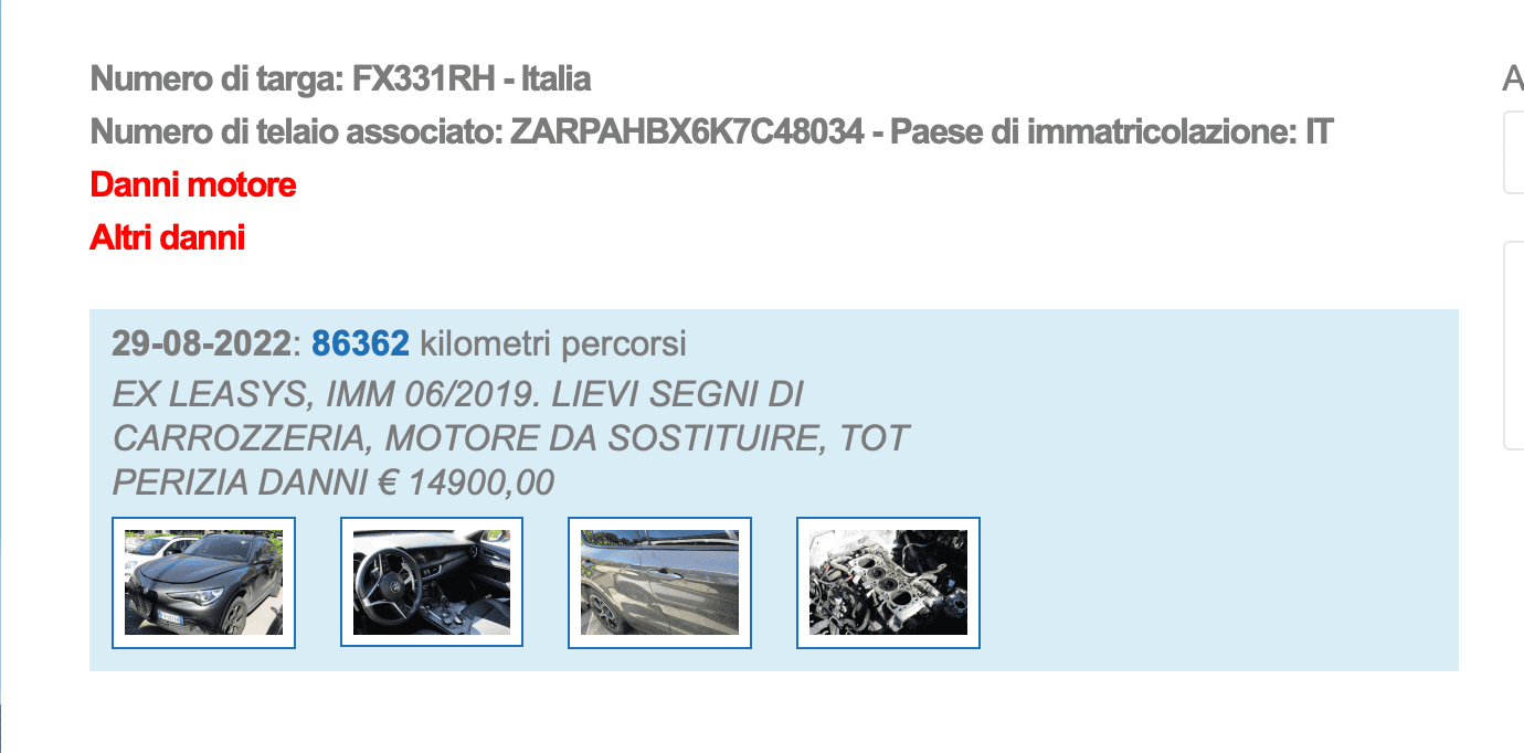 Numero di telaio associato: ZARPAHBX6K7C48034 - Paese di immatricolazione: IT
